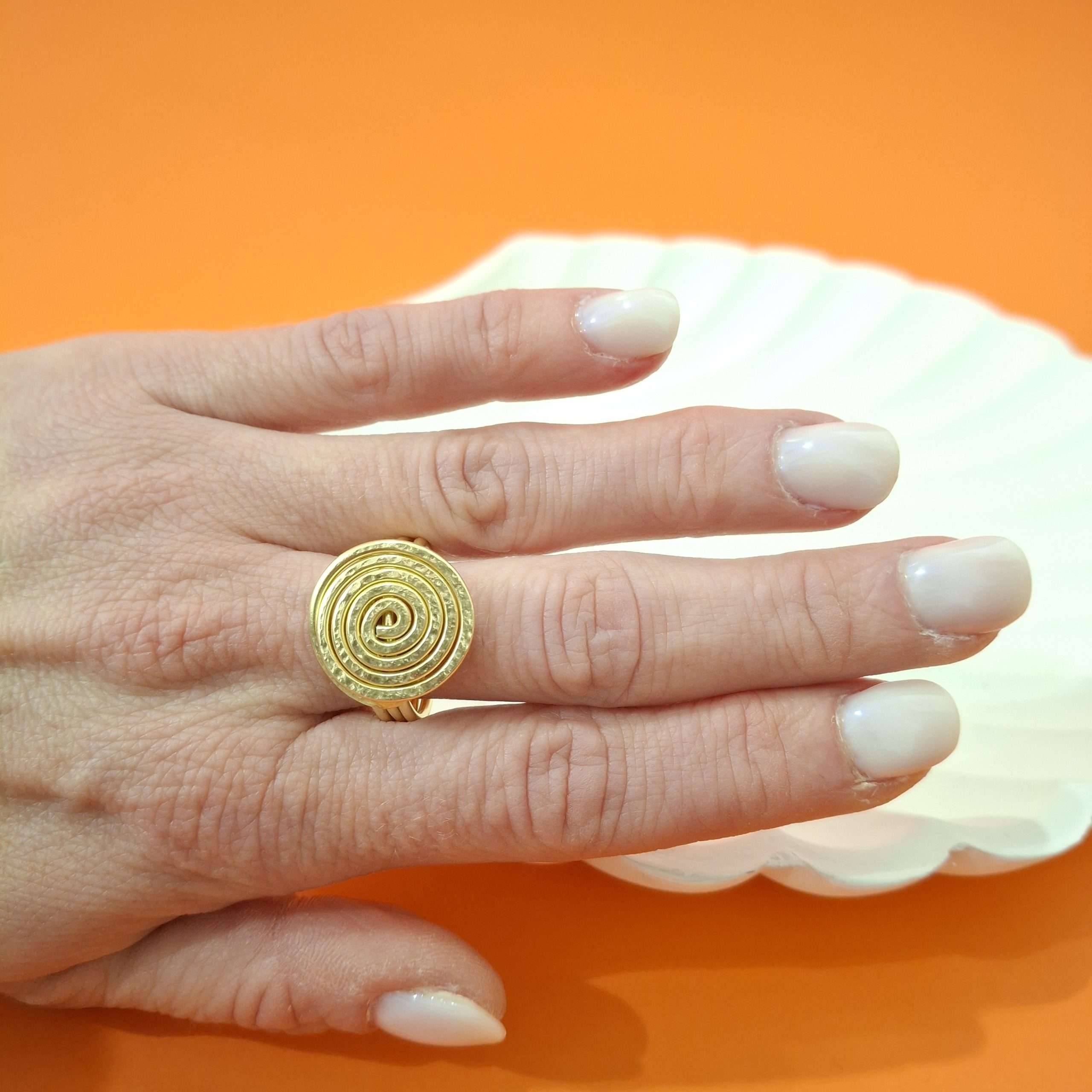 Interamente realizzato a mano con alluminio anodizzato, light gold. Resistente all’acqua, col tempo non cambia colore, non ossida. Prodotto anallergico. Il lavoro di martellatura finale dona alla struttura una texture dinamica e non il solito liscio banale