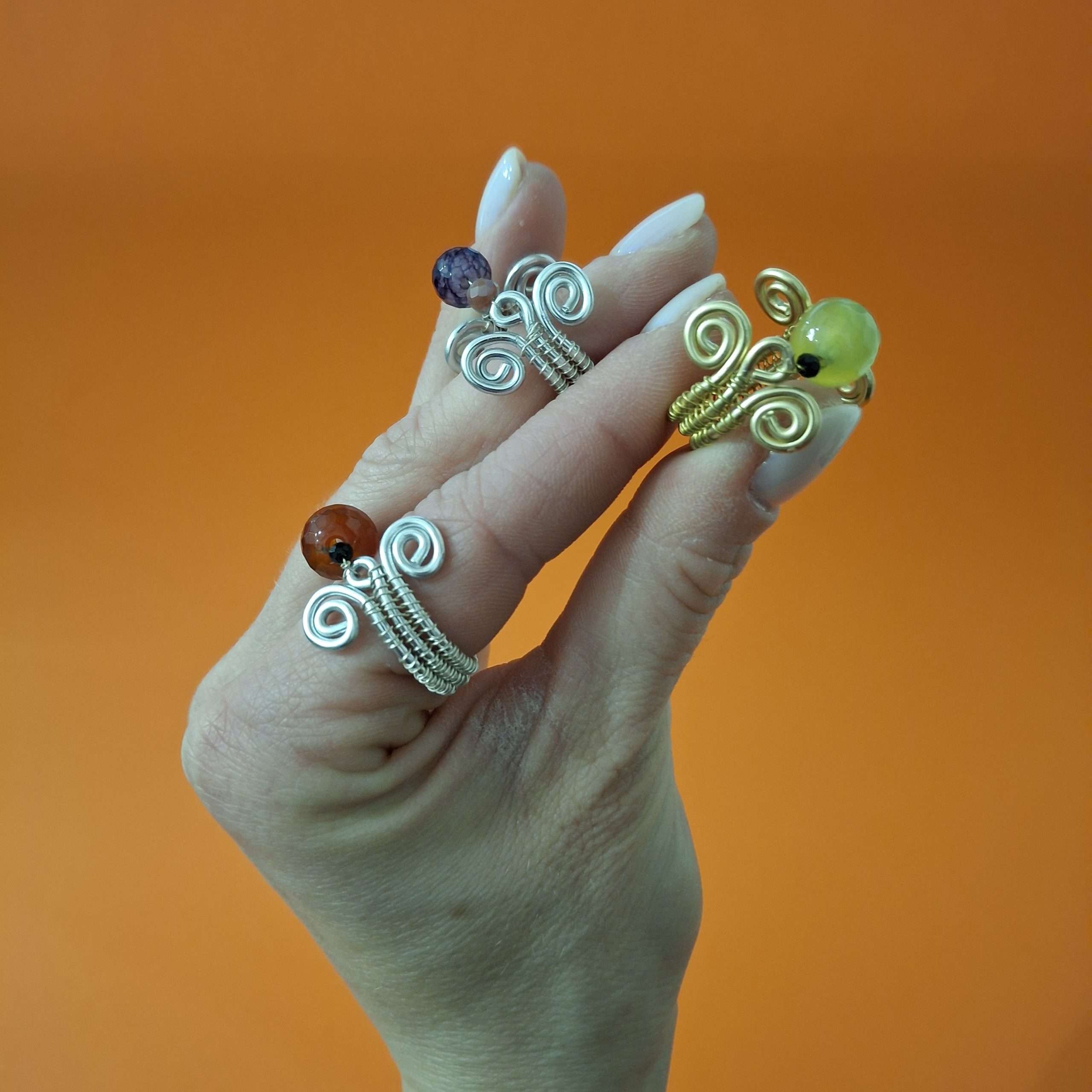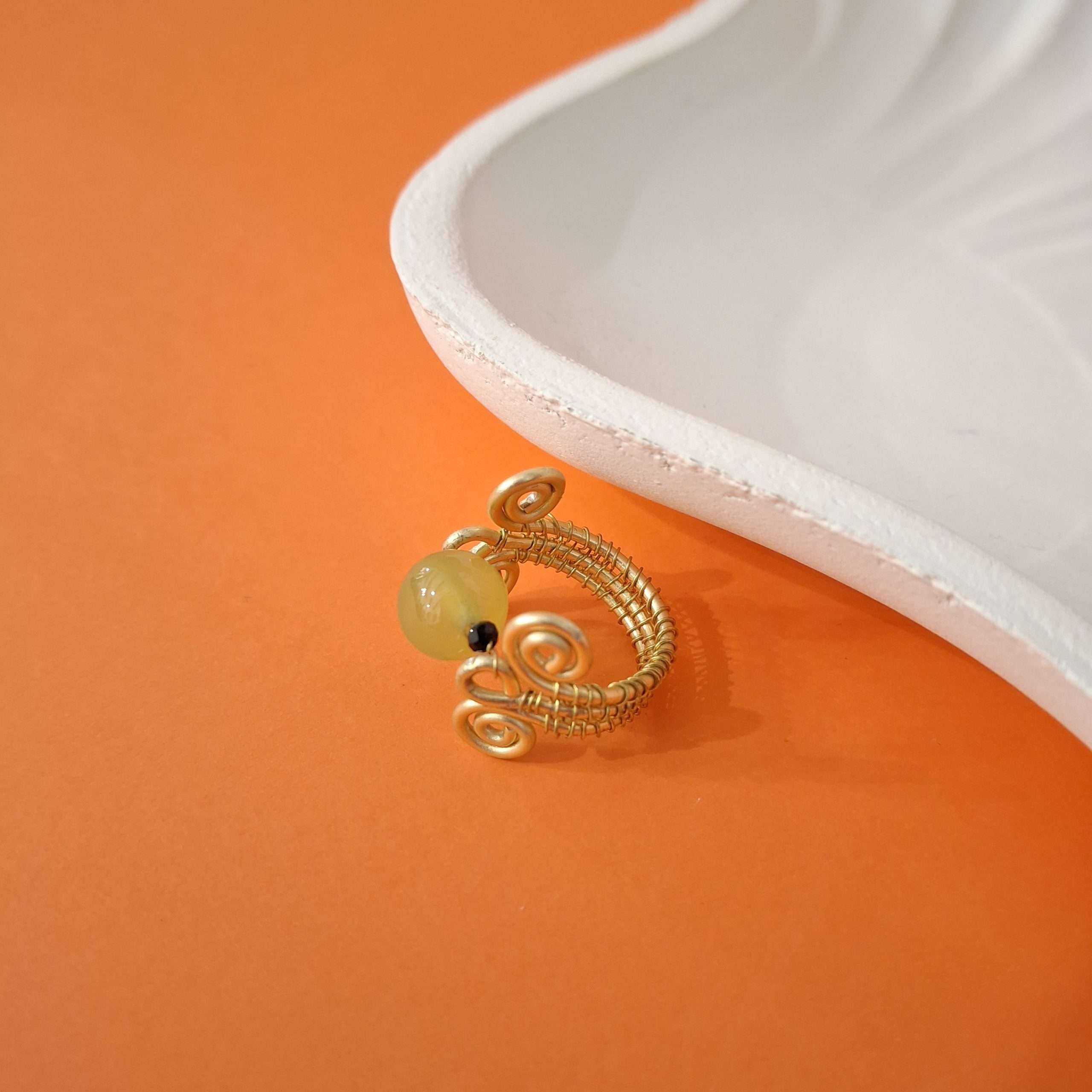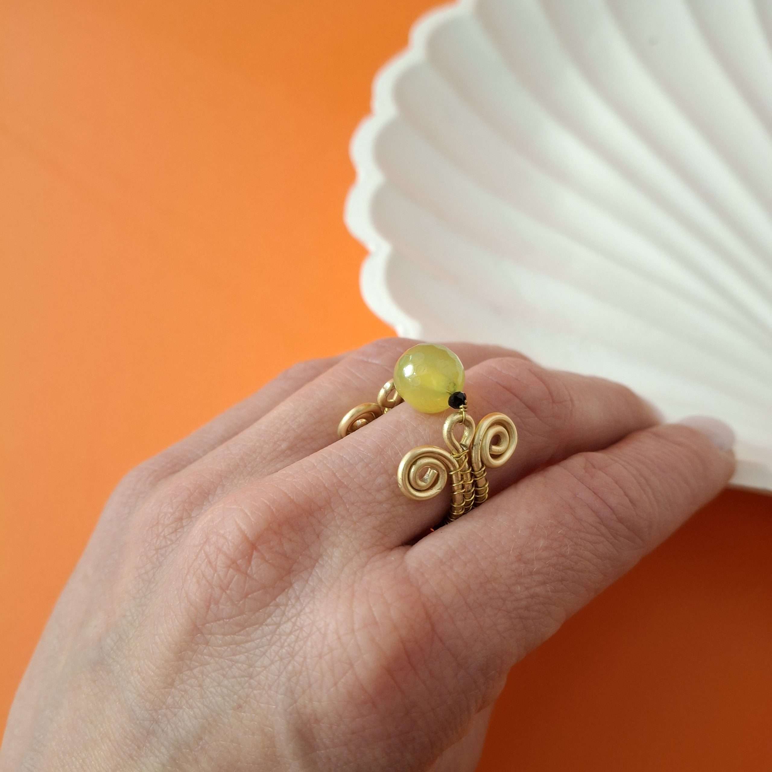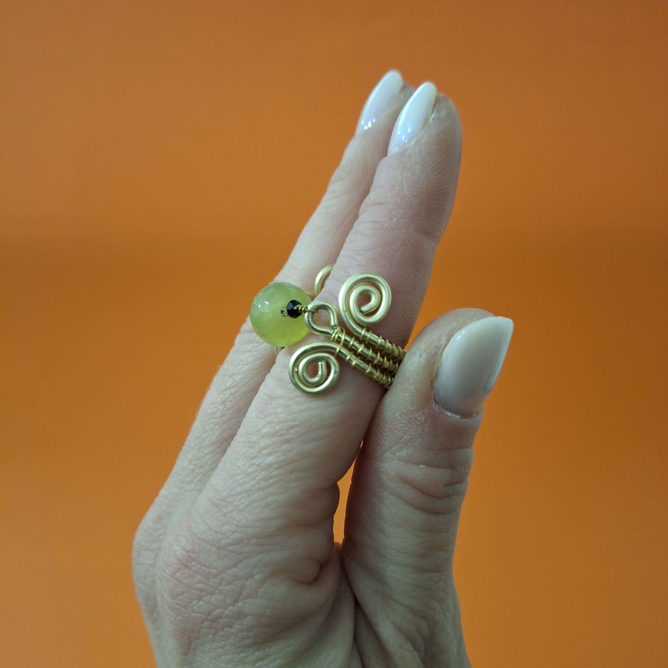 Anello interamente realizzato a mano con la tecnica Wire. Alluminio anodizzato gold, agata lime, cristalli neri. Prodotto anallergico, resistente all’acqua, non cambia colore col tempo, non ossida. Un intreccio di metalli con pietra naturale e micro-cristalli, da abbinare ad ogni stile di outfit