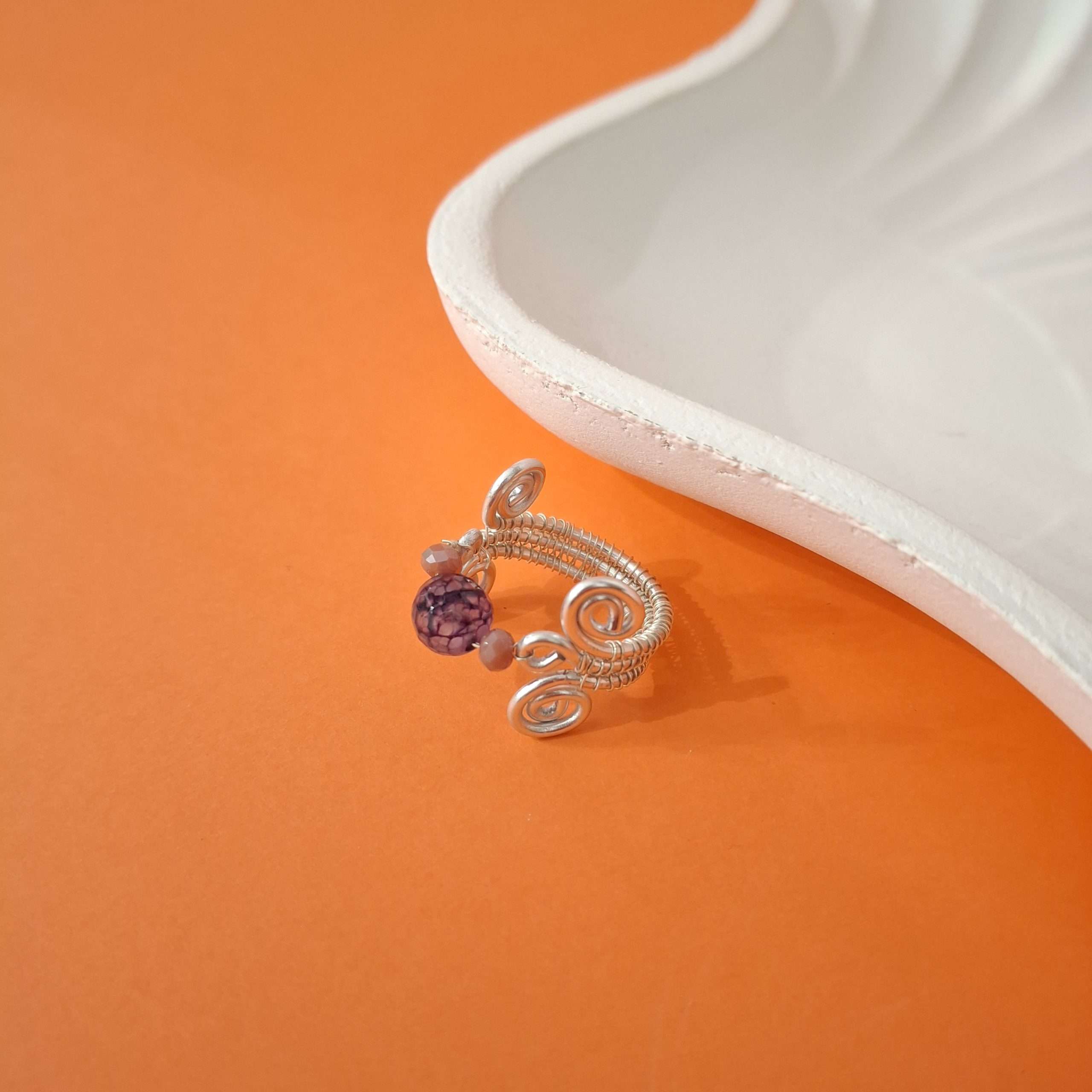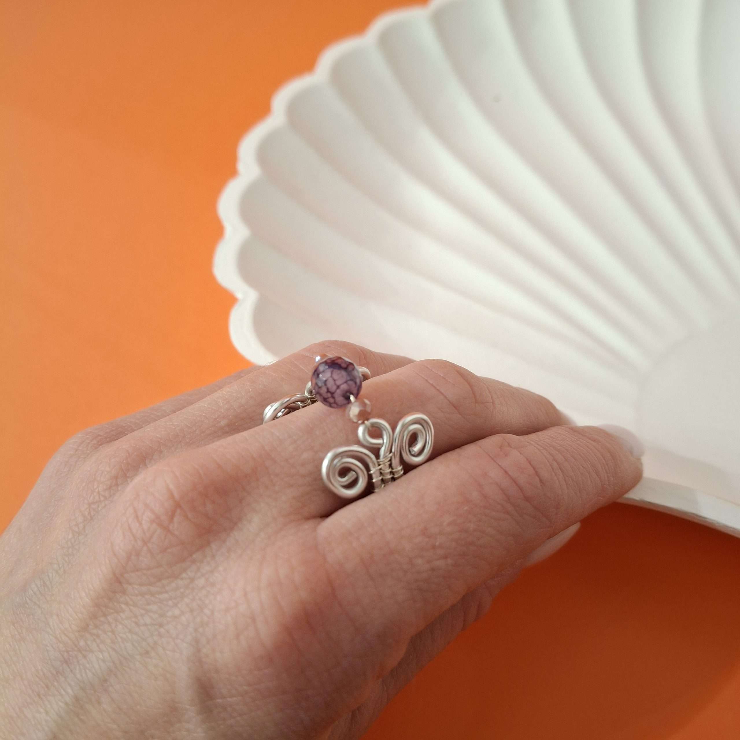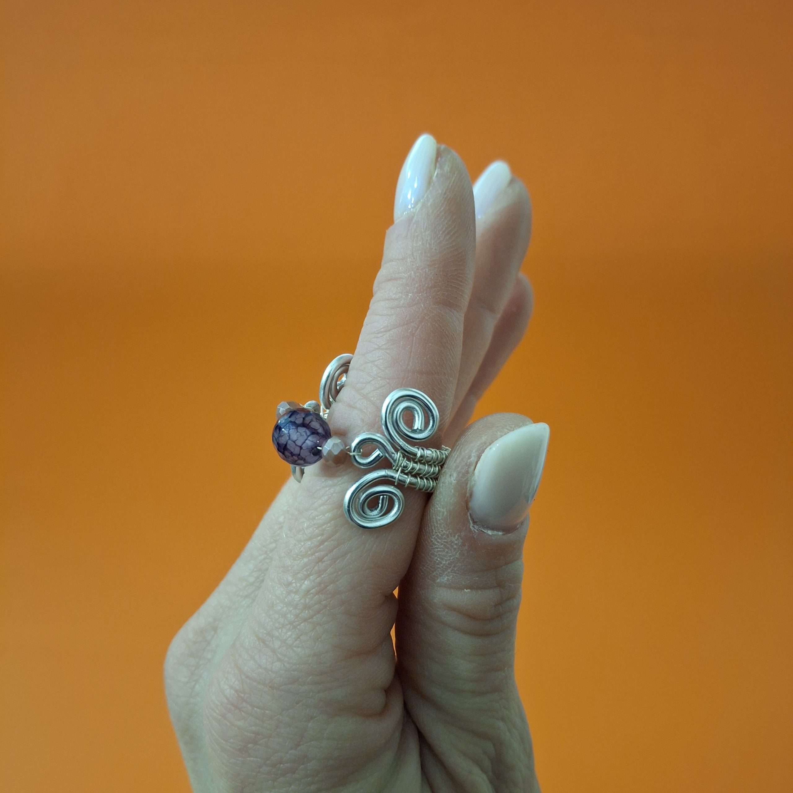 Anello interamente realizzato a mano con la tecnica Wire. Alluminio anodizzato silver, agata sfumata viola, cristalli rosa antico. Prodotto anallergico, resistente all’acqua, non cambia colore col tempo, non ossida. Un intreccio di metalli con pietra naturale e micro-cristalli, da abbinare ad ogni stile di outfit