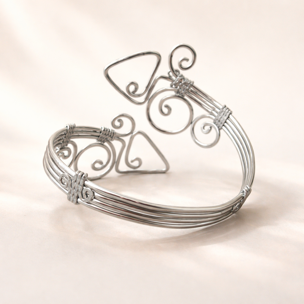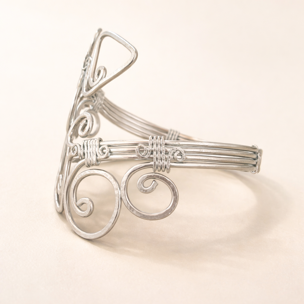 Bracciale in alluminio anodizzato, modellato e martellato a mano con la tecnica Wire. Il materiale non ossida e non cambia colore, puoi quindi utilizzarlo anche al mare.