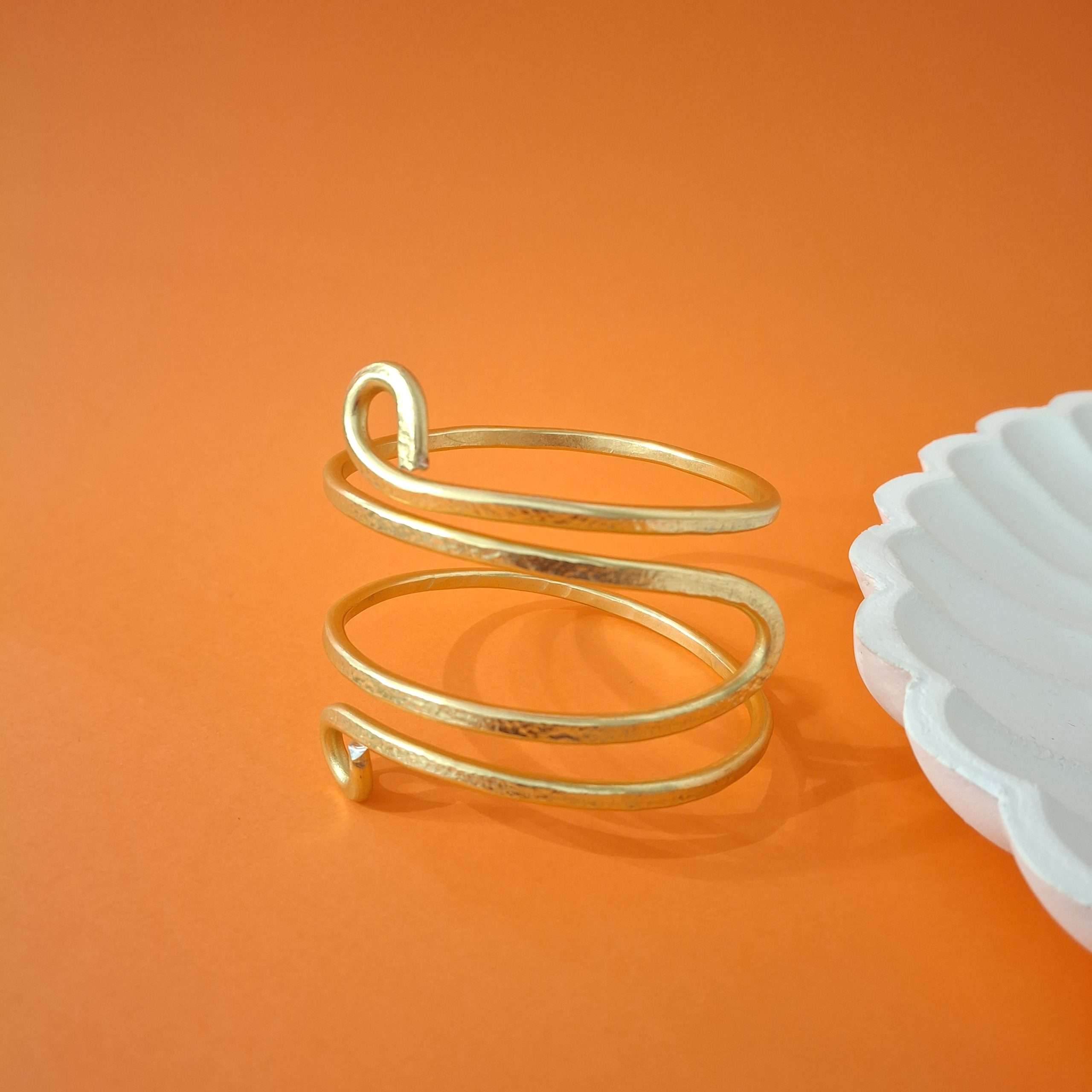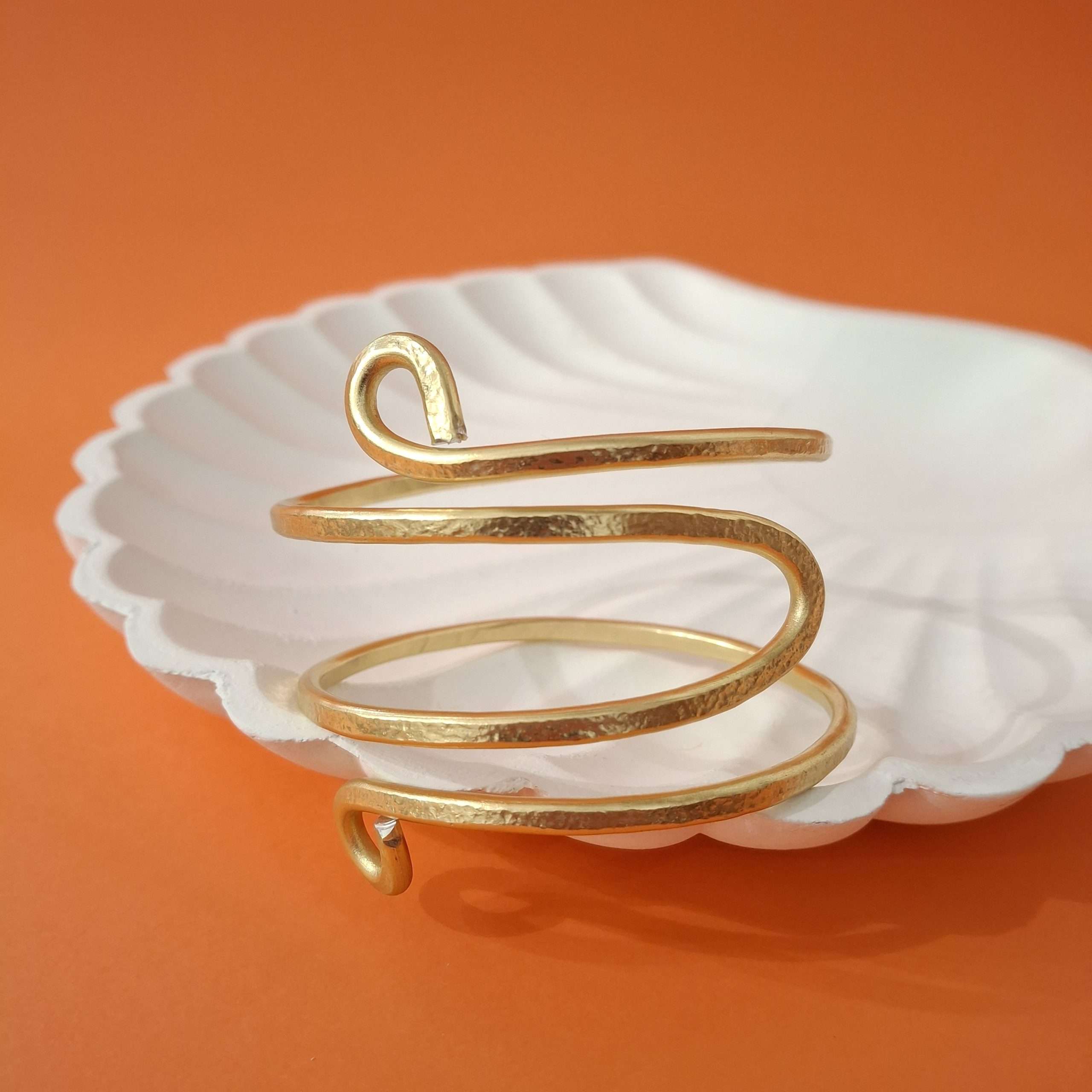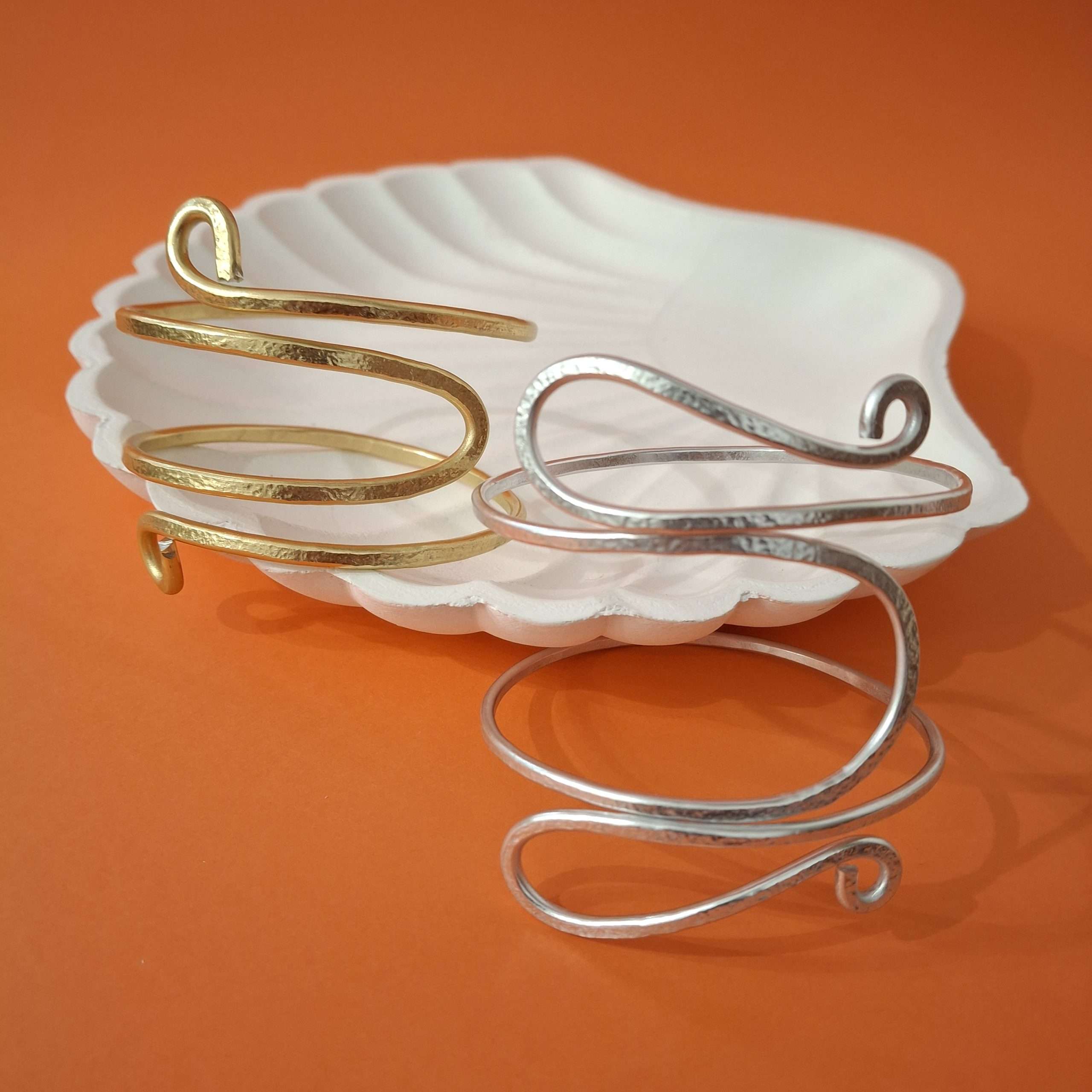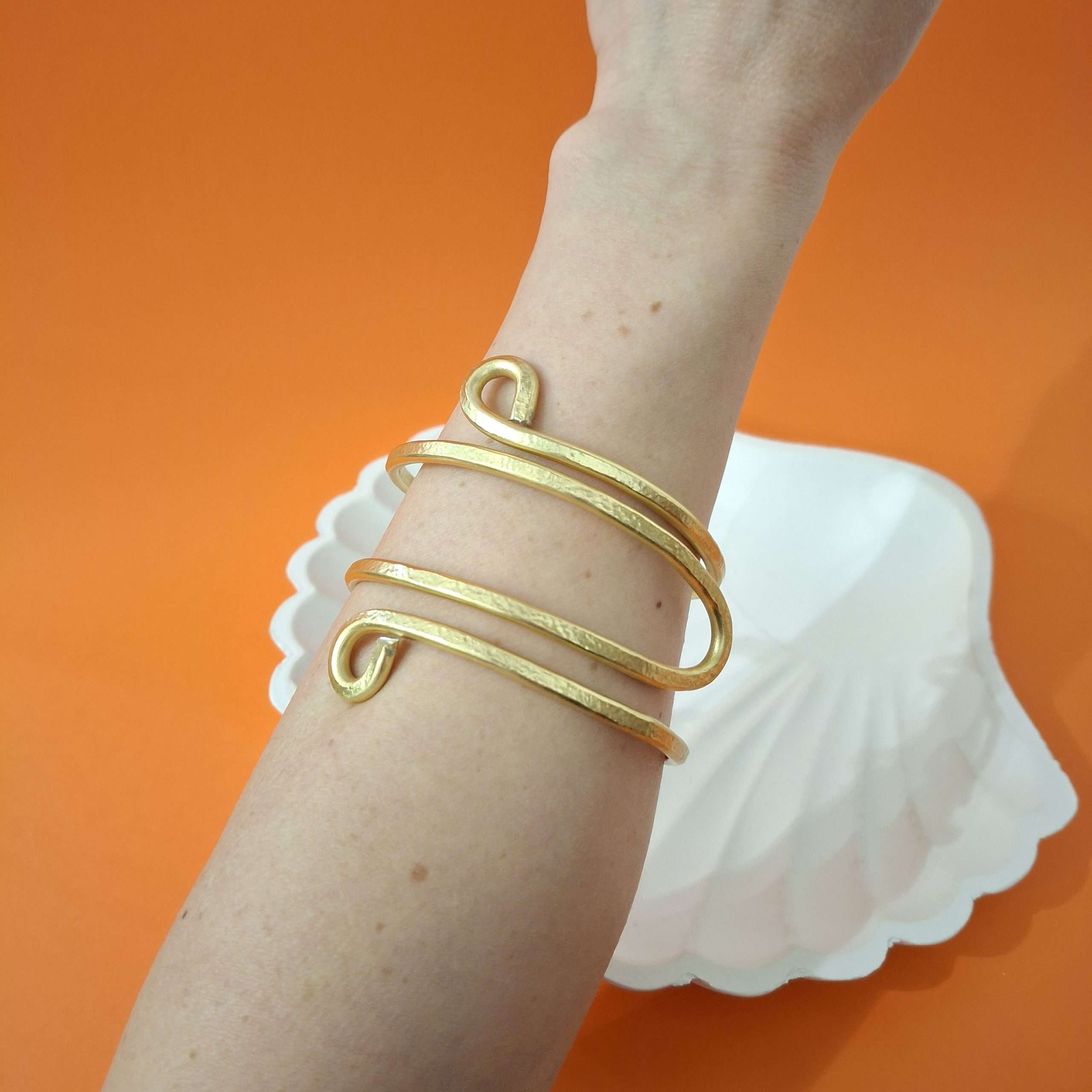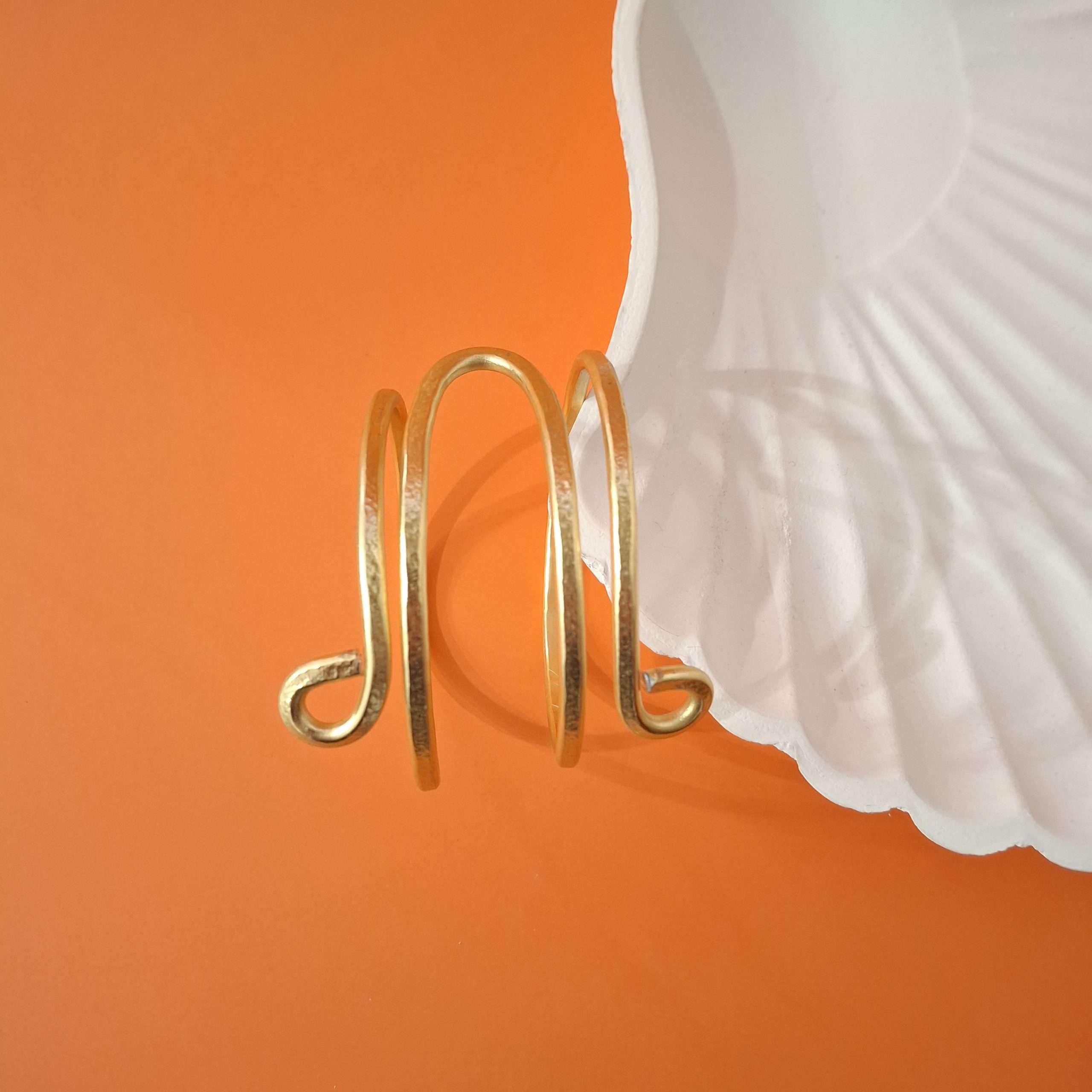 Interamente modellato a mano. Martellato su una speciale superfice che conferisce al metallo una texture dinamica e non completamente liscia. Alluminio anodizzato light gold, anallergico. Non cambia colore nel tempo e a contatto con l’acqua. Regolabile, può essere indossato sia sulla pelle, sia su maglioni e camicie .