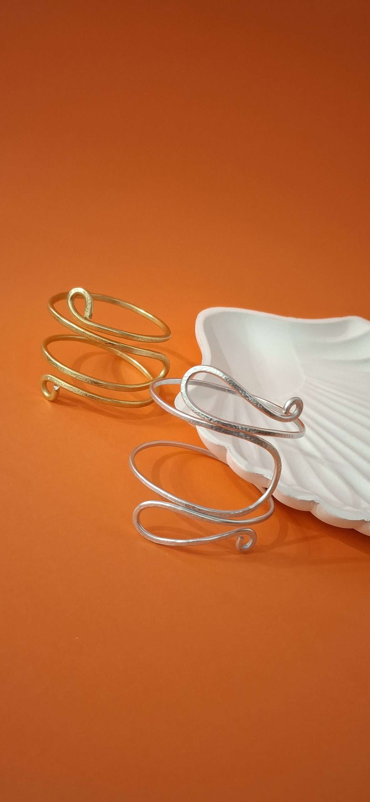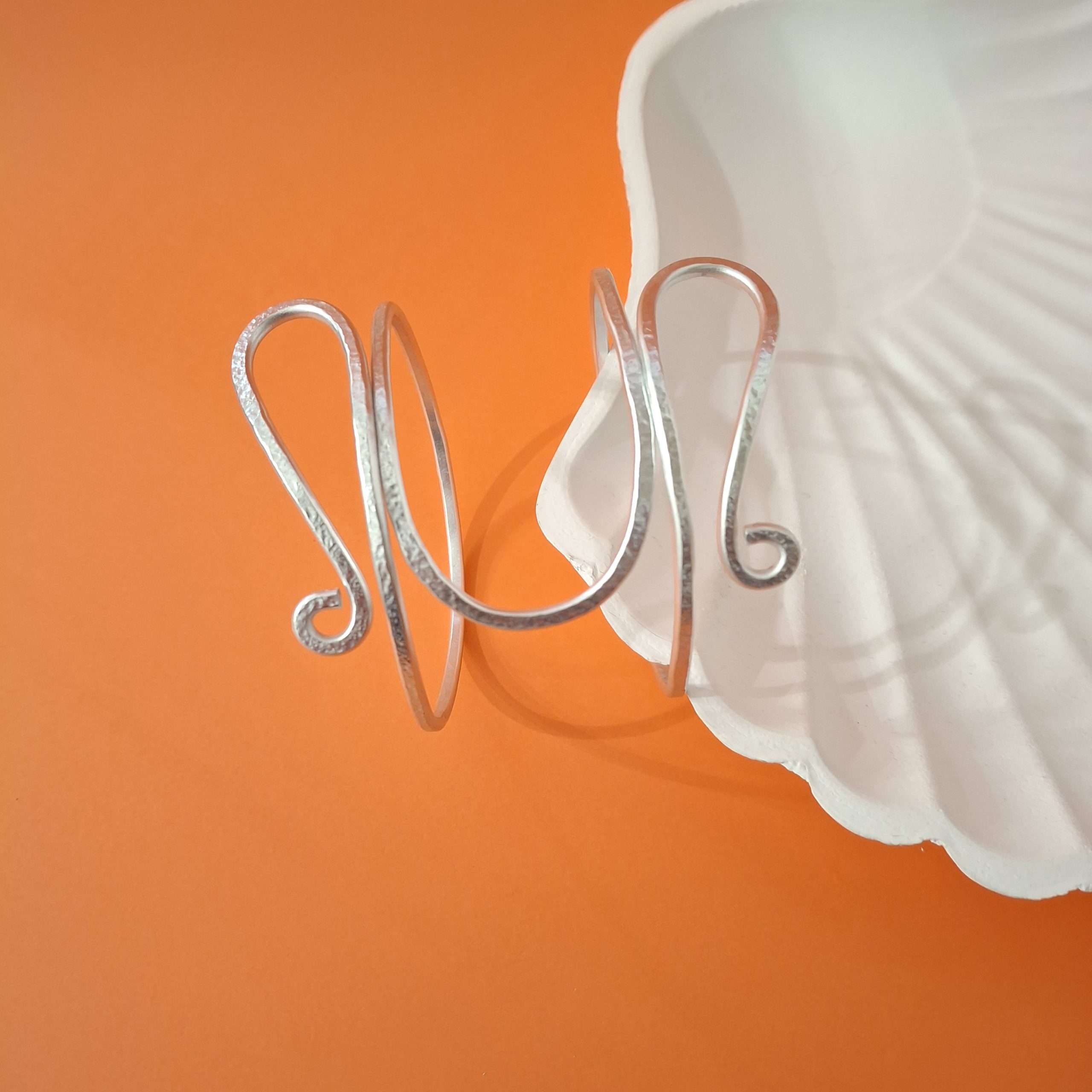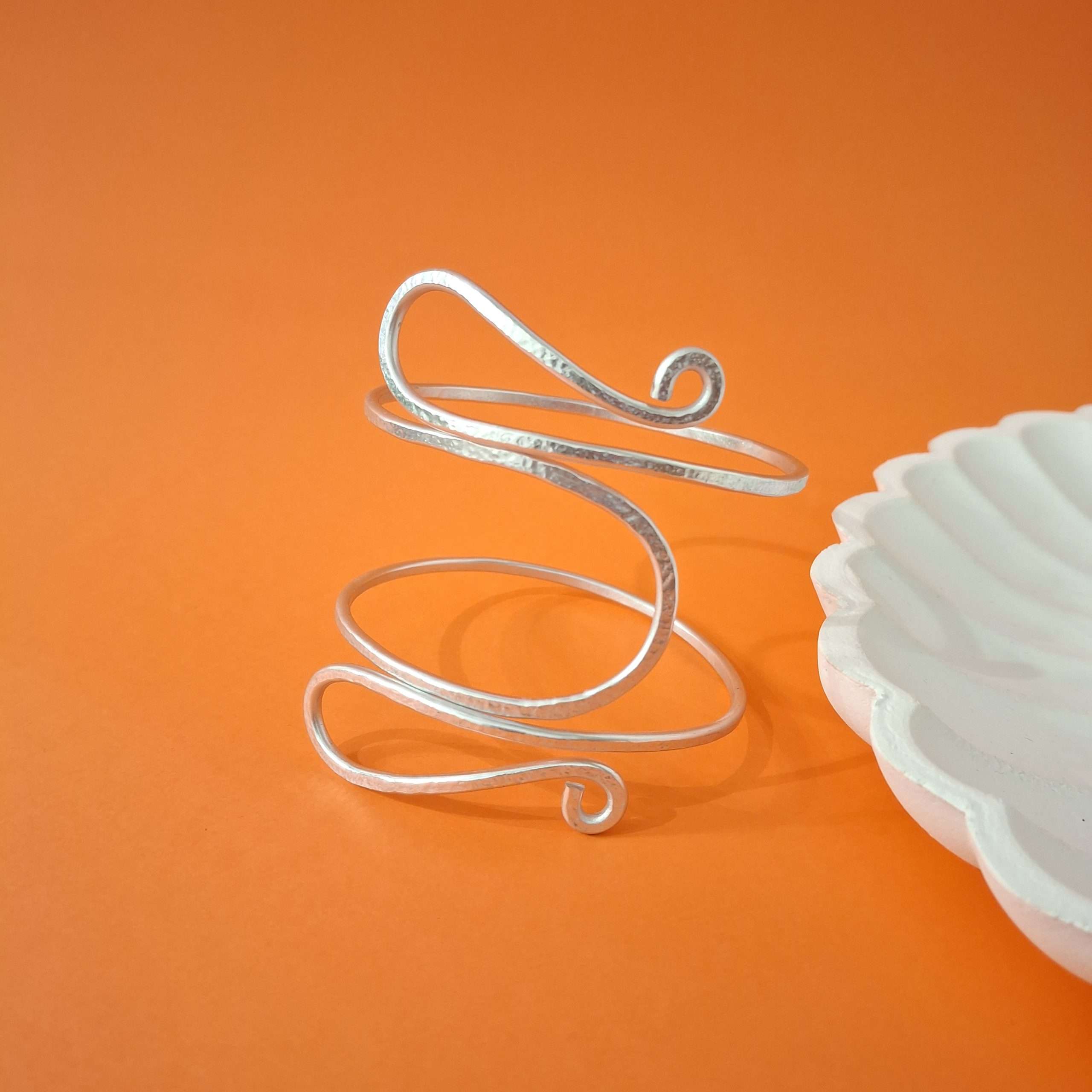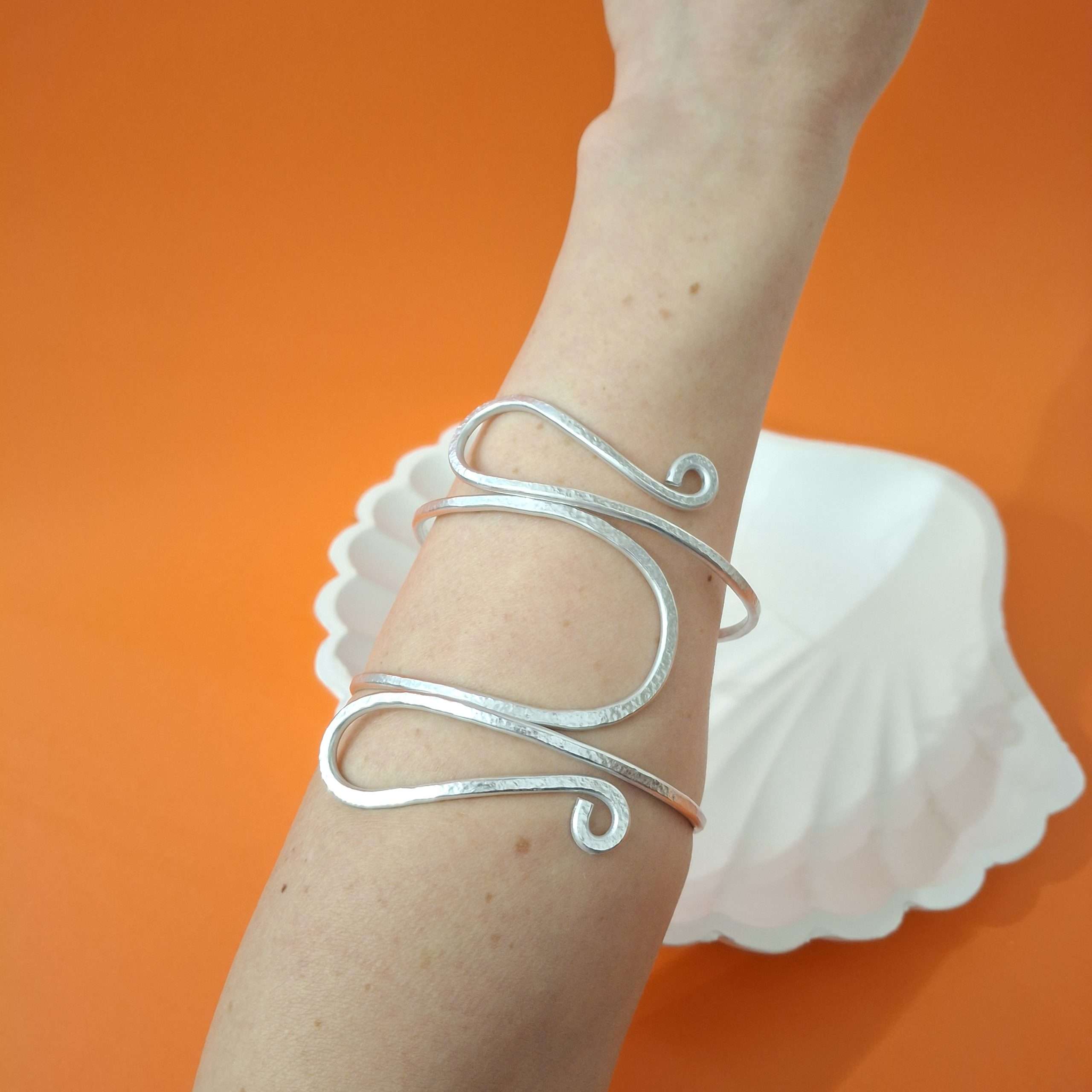 Interamente modellato a mano. Martellato su una speciale superfice che conferisce al metallo una texture dinamica e non completamente liscia. Alluminio anodizzato silver, anallergico. Non cambia colore nel tempo e a contatto con l’acqua. Regolabile, può essere indossato sia sulla pelle, sia su maglioni e camicie .