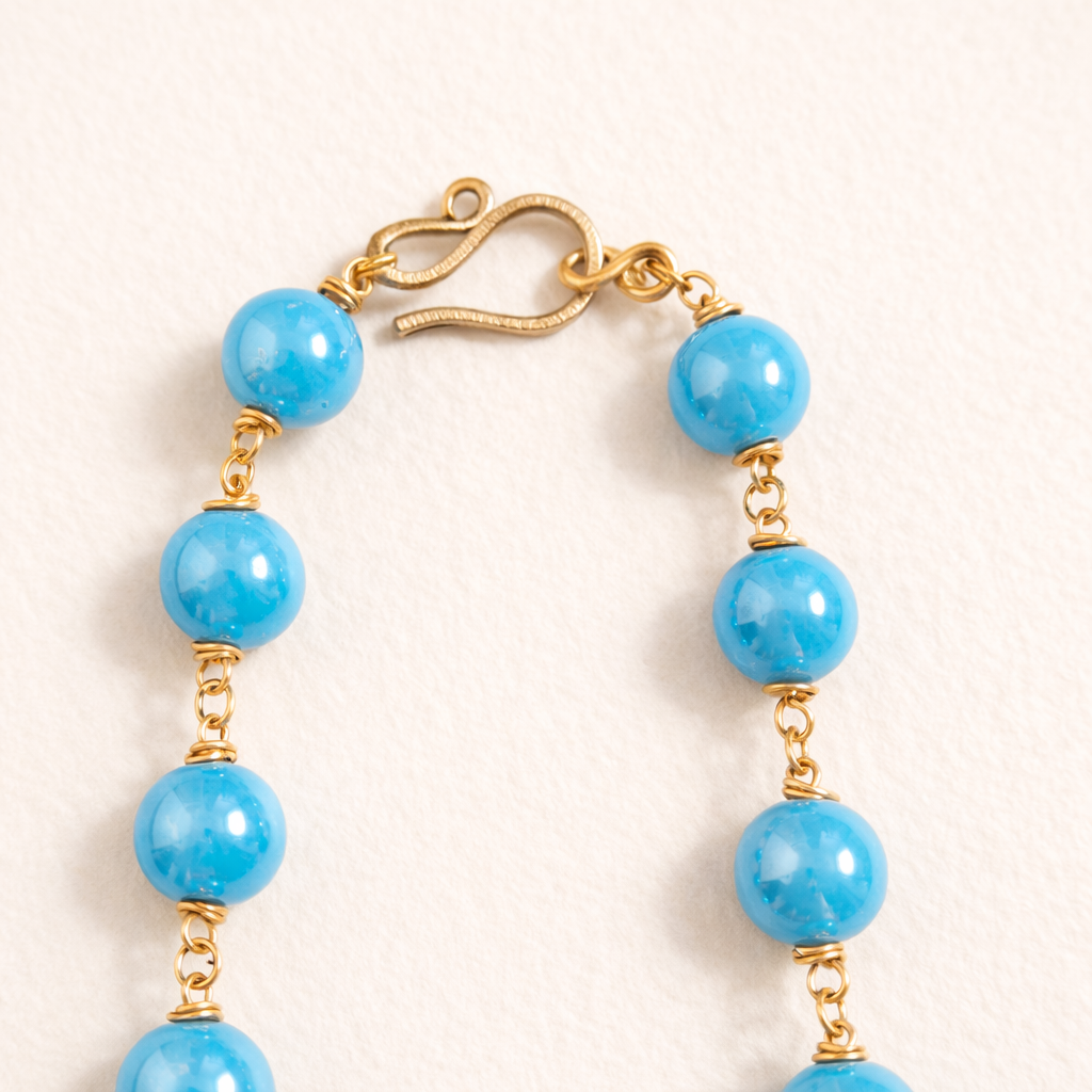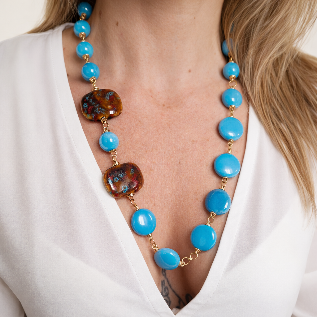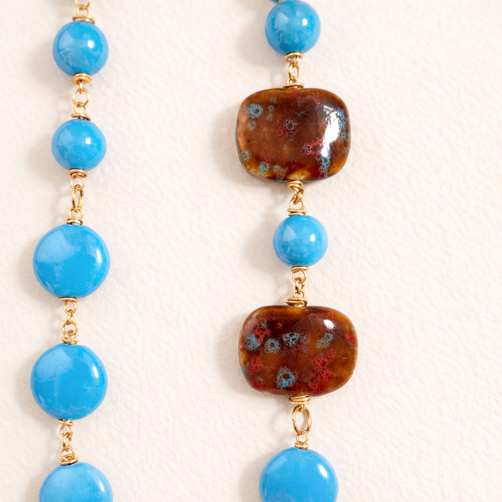 Collana realizzata a mano con ceramiche smaltate. La chiusura è realizzata a mano con alluminio anodizzato, non ossida e non cambia colore
