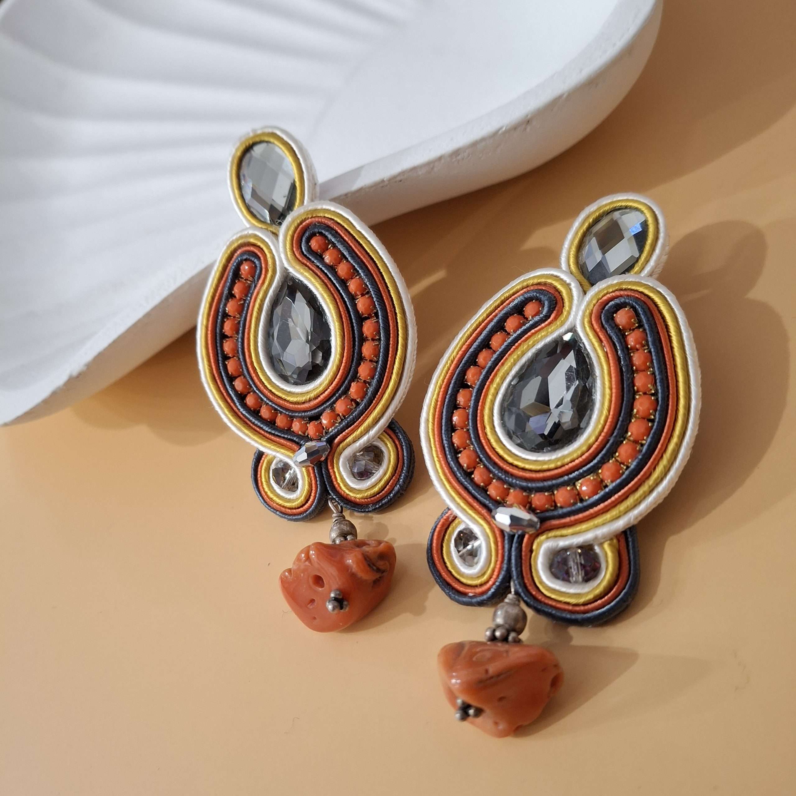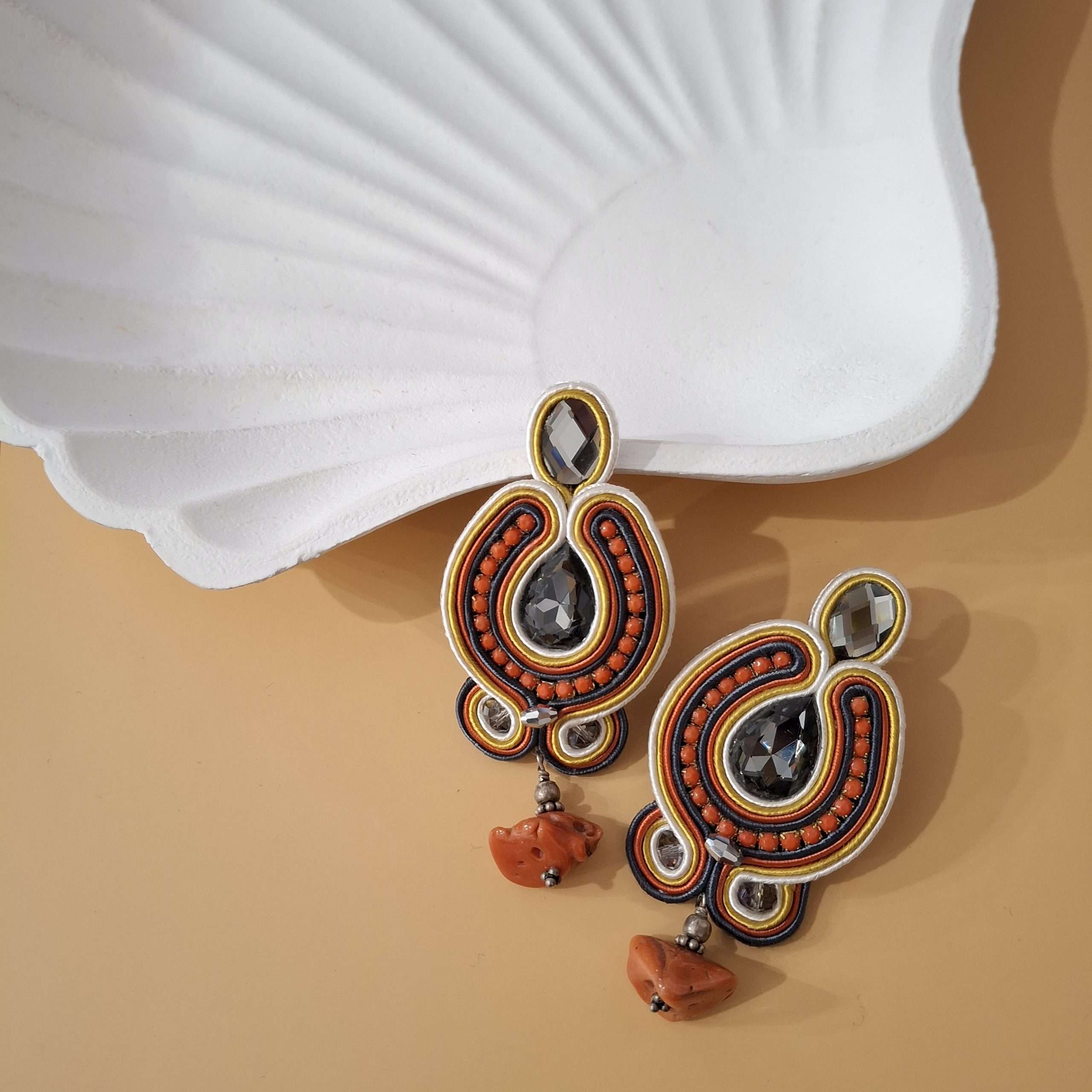 Orecchini interamente cuciti a mano con la tecnica del Soutache. Cabochon di cristallo ovale canna di fucile, cabochon di cristallo a goccia canna di fucile, catena di strass in resina arancione, cristalli, pasta di corallo arancione pendente. Retro rifinito in simil-pelle. Base perno al lobo in acciaio inossidabile, anallergico.