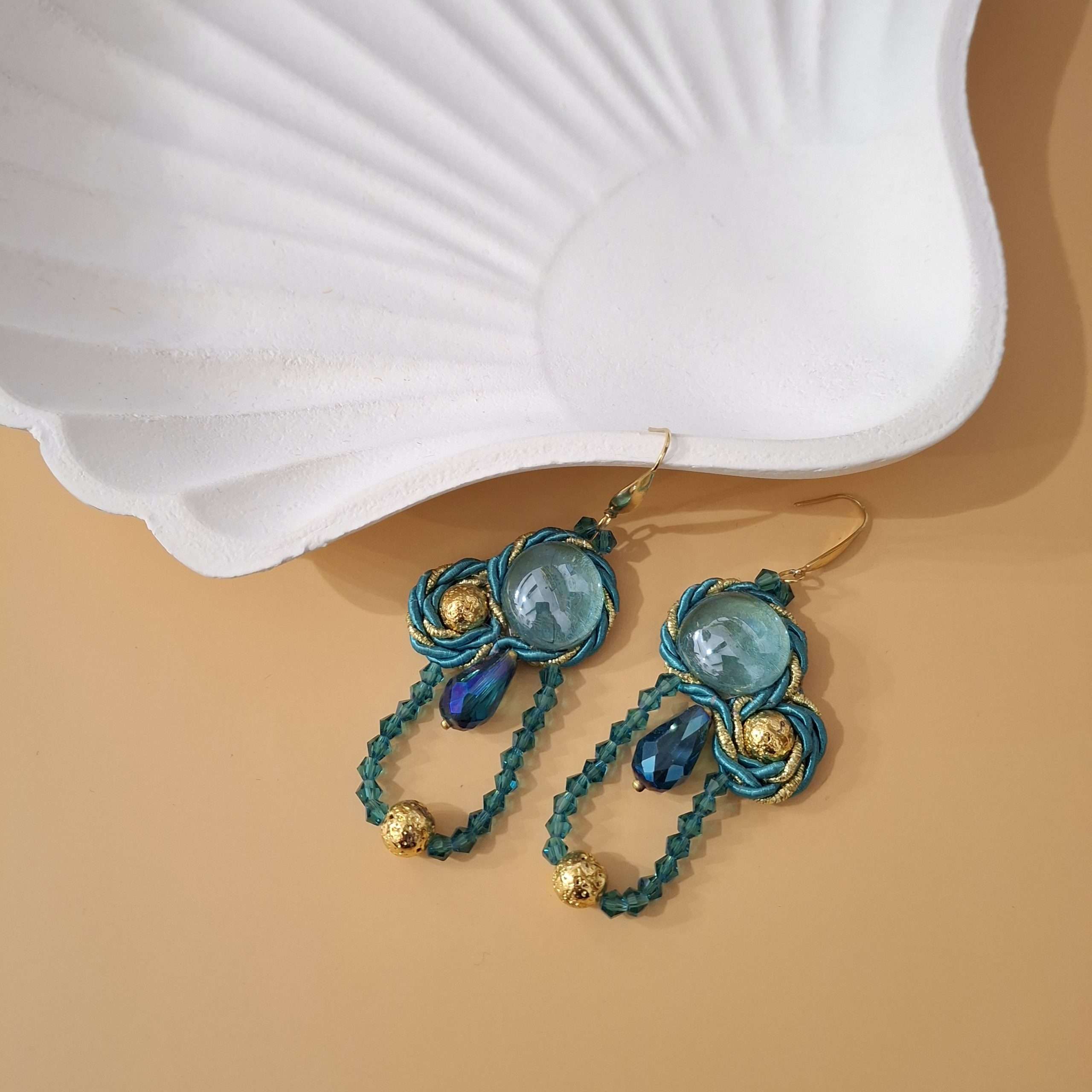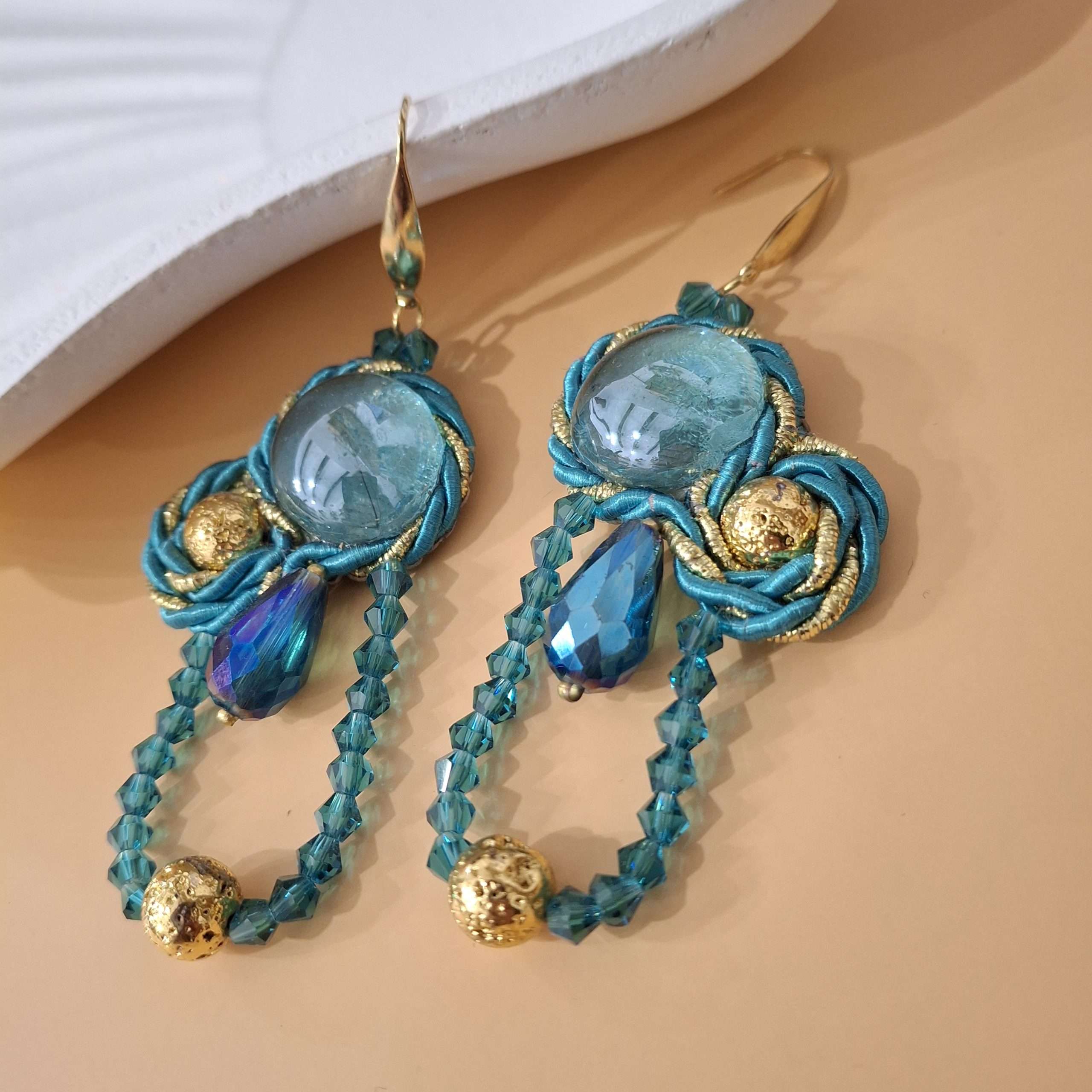 Orecchini interamente cuciti a mano con la tecnica del Soutache. Cabochon centrale in vetro di Murano acqua marina, cordoncini bicolore, cristalli bicono, pietre laviche smaltate oro, goccia di cristallo cangiante. Monachella color oro in acciaio inossidabile e anallergico. Retro rifinito in simil-pelle. Un pezzo unico per dare luce ai tuoi outfit