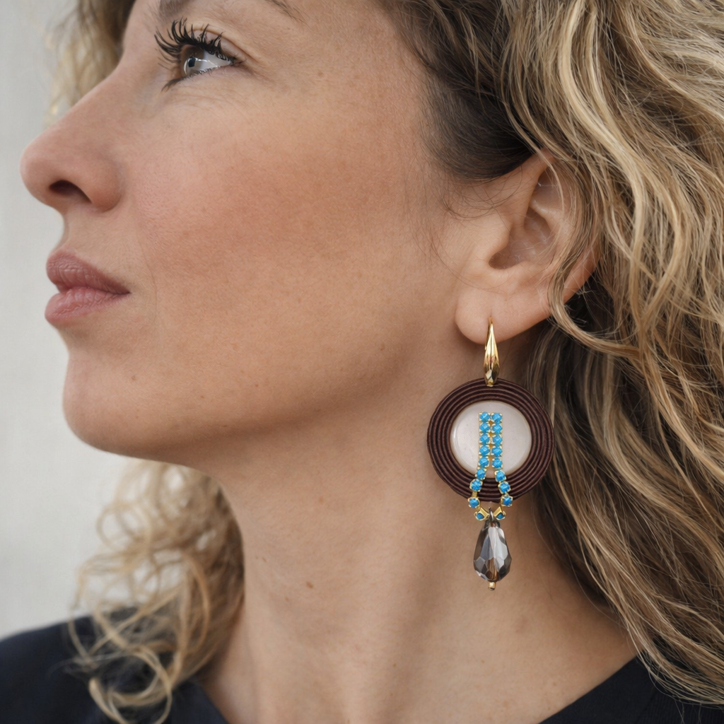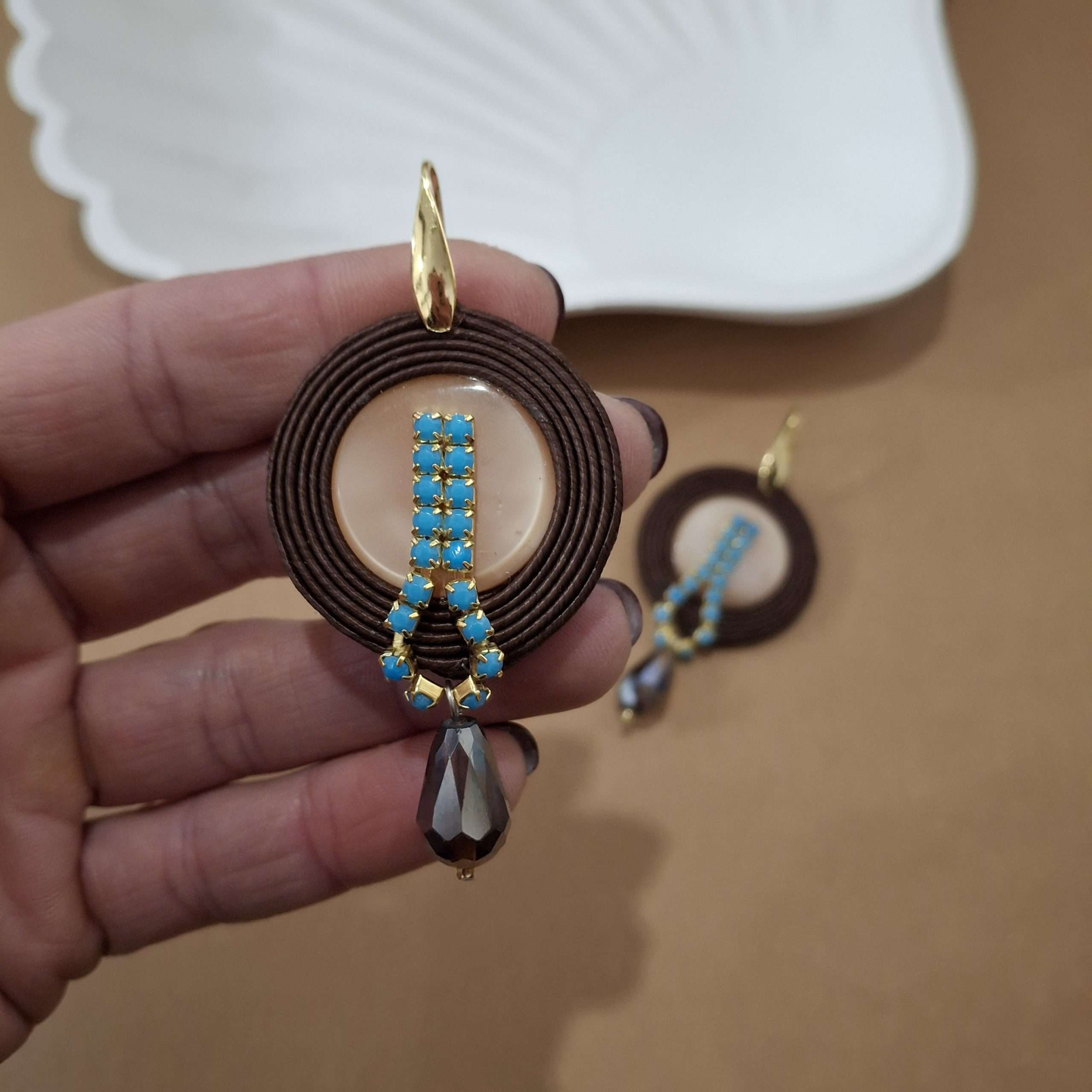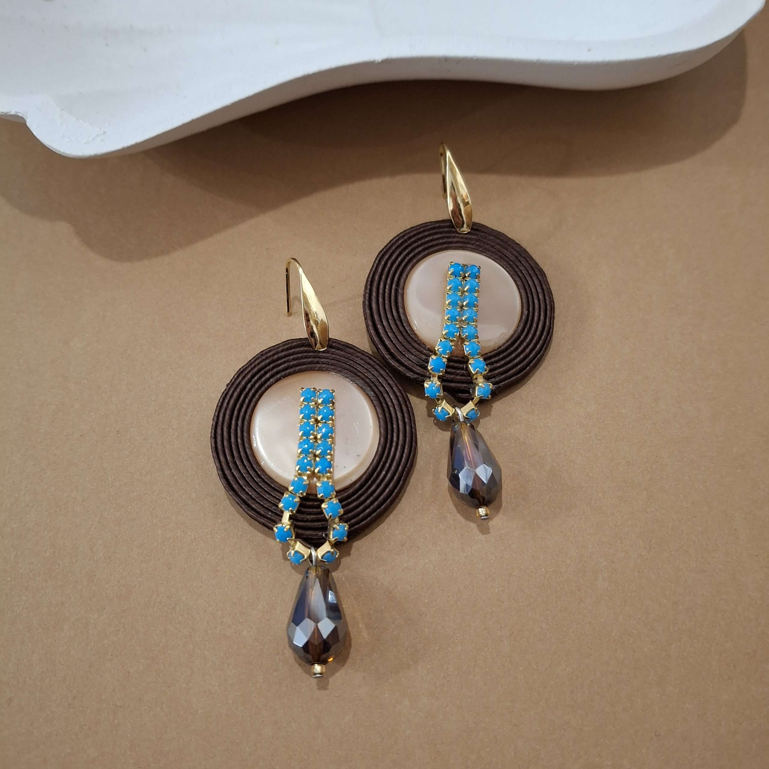 Interamente realizzati a mano con la tecnica del Soutache. Bottone in resina centrale, Catene di srtass matti turchesi, goccia di cristallo pendente, monachelle in acciaio inossidabile dorato. Retro rifinito in simil-pelle