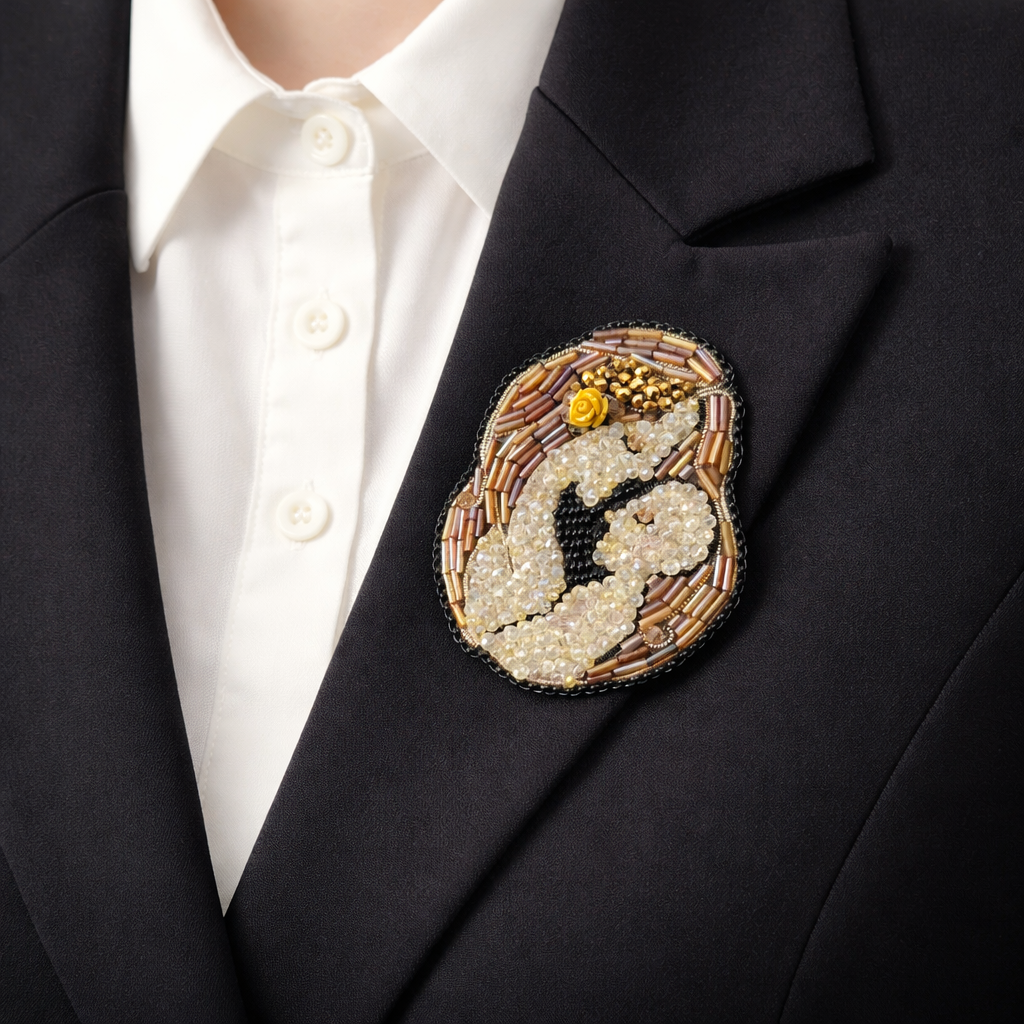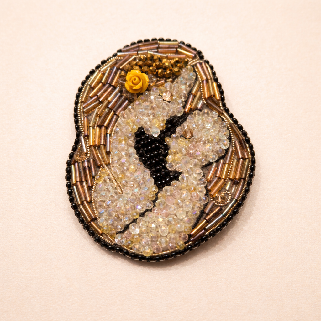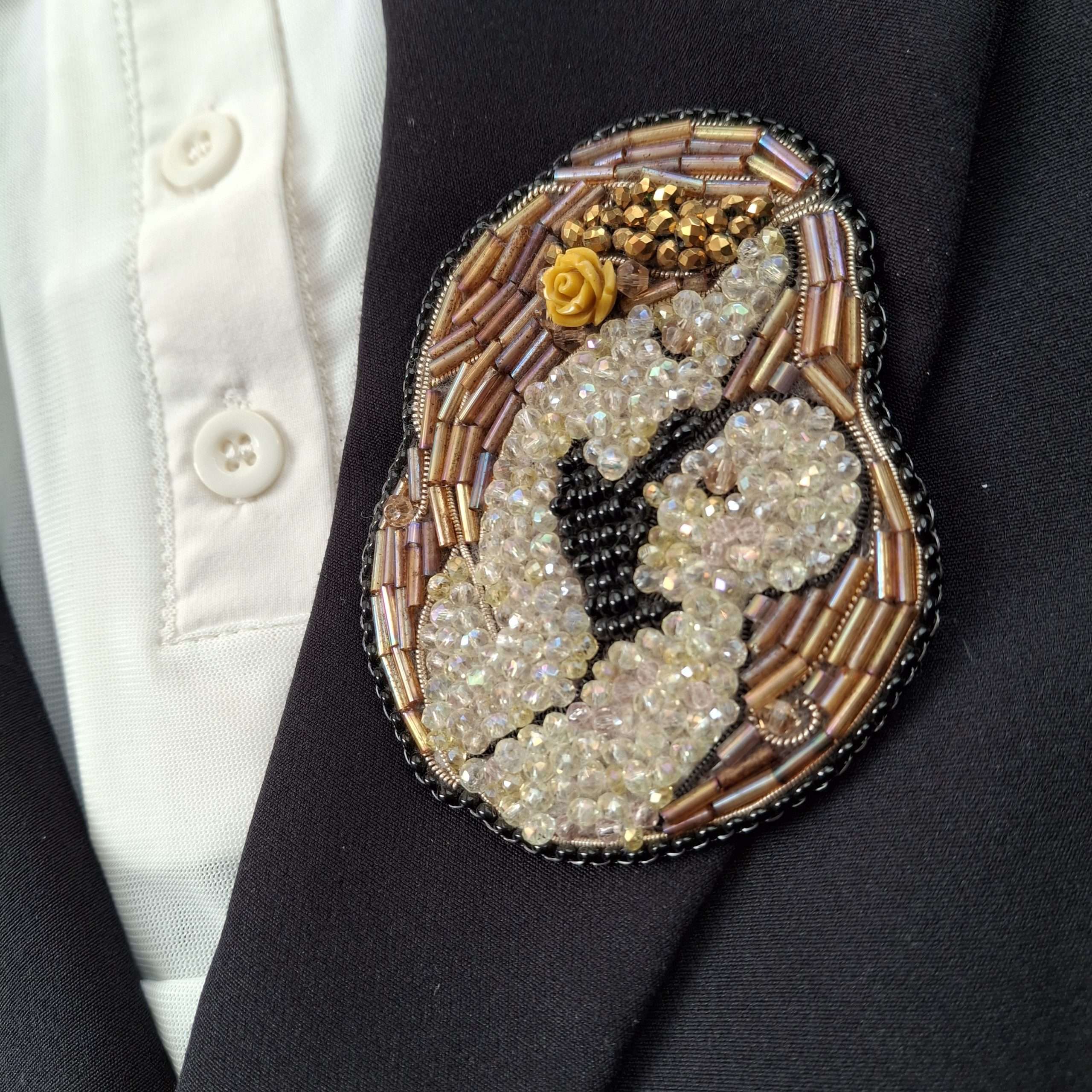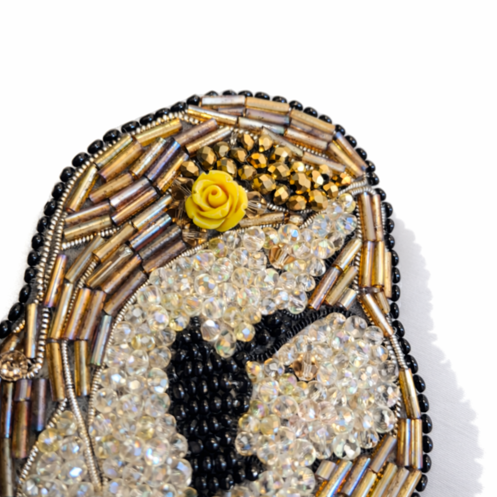 Spilla interamente cucita a mano, dal disegno su carta al ricamo su feltro. Una cascata di cristalli, perline in vetro di varie forme e colori, rosellina senape in pasta polimerica. Retro rifinito in simil-pelle. Questa creazione non vuole riferirsi esclusivamente alla maternità , bensì vuole rappresentare un aspetto più ampio dell’immenso amore che le donne sono in grado di donare, senza nulla chiedere in cambio.