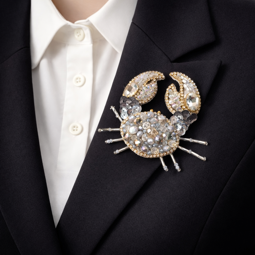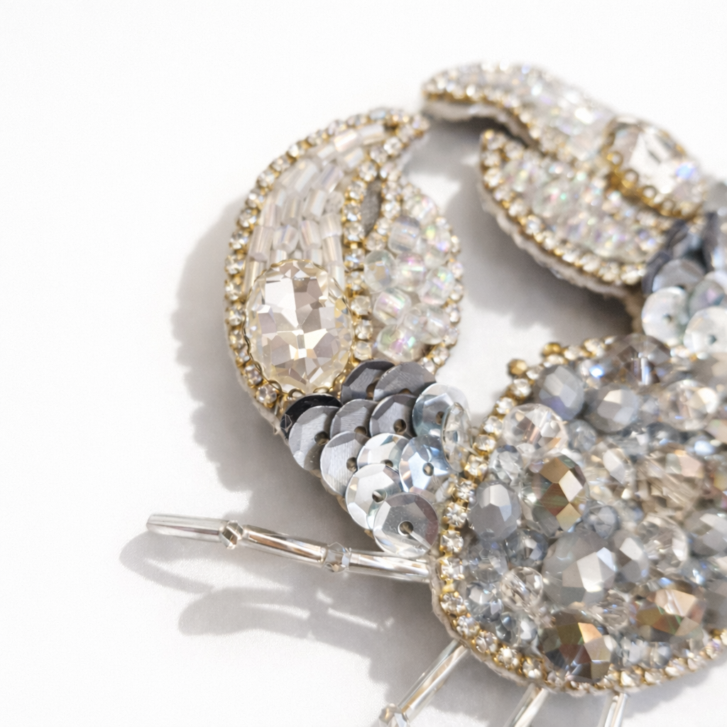 Spilla interamente realizzata a mano, dal disegno su carta, al ricamo su feltro. Una cascata di cristalli dalle varie sfumature di grigio/argento e varie dimensioni, paillettes, catene di strass, coralli tubolari argento per le zampe. Retro rifinito in simil-pelle. Indossa ciò che caratterizza di più il tuo essere. Un accessorio ricco di significato per chi ama i segni delle stelle