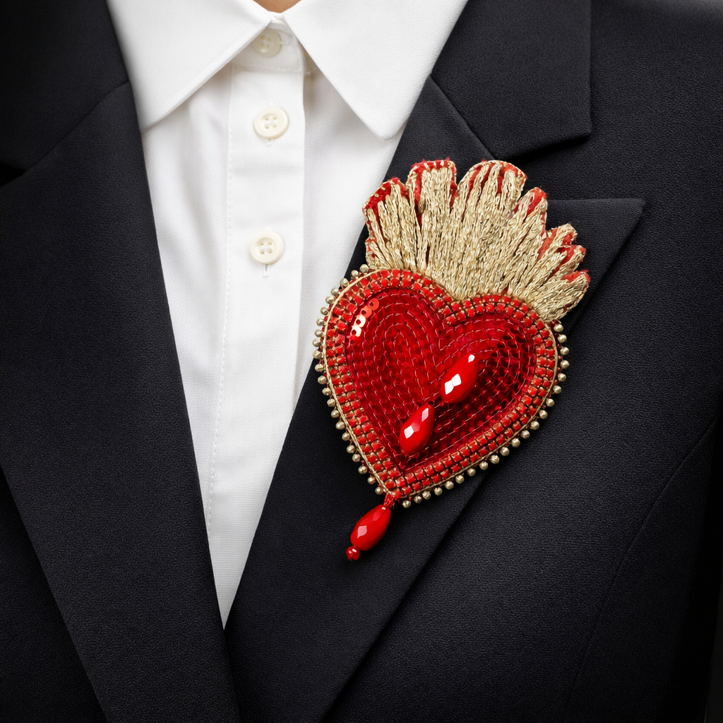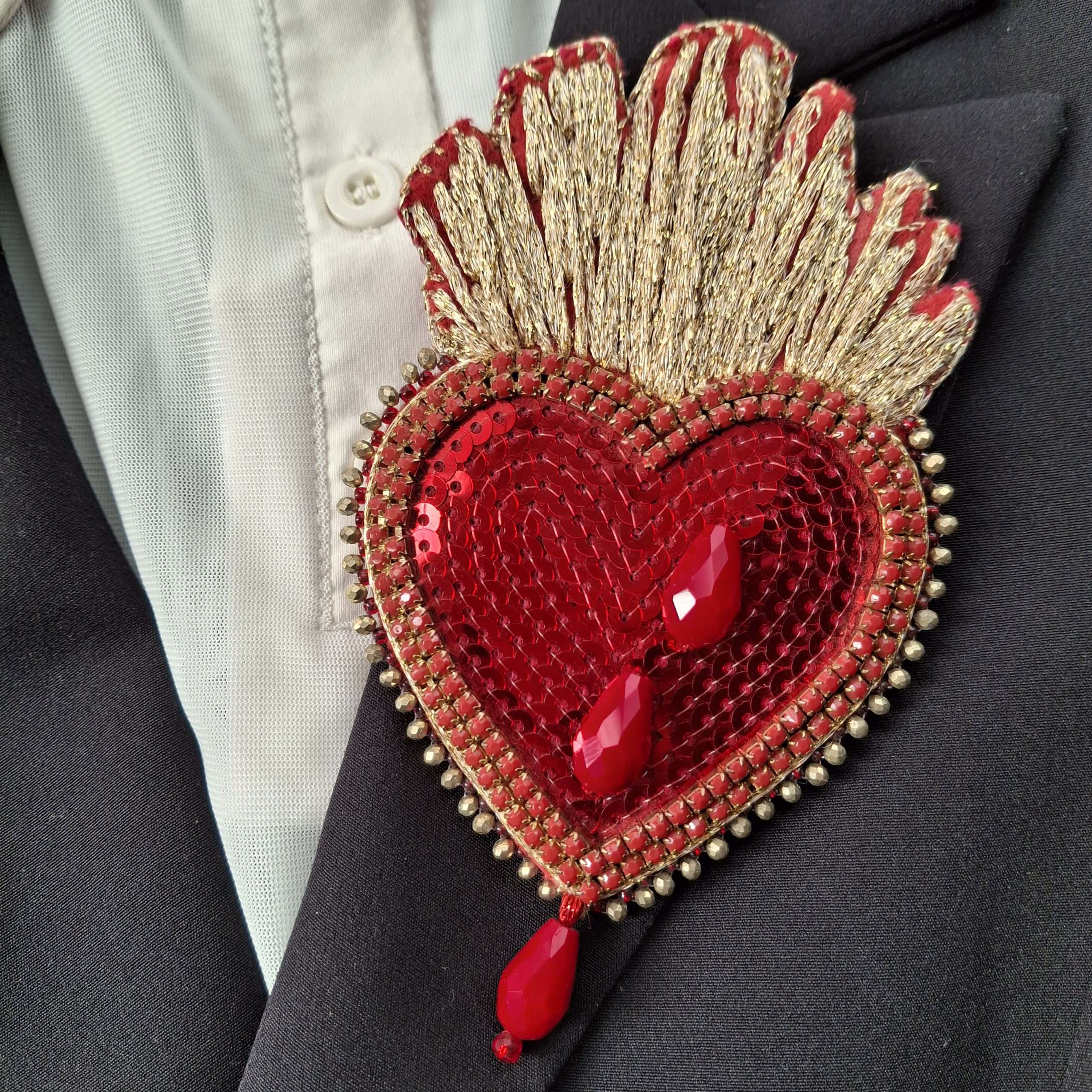 Spilla interamente realizzata a mano, dal disegno su carta al ricamo su peltro. Intero cuore realizzano con paillettes rosse , catene di strass, perline dorate per la bordatura. Retro rifinito in velluto rosso. I cuori sacri sono utilizzati da sempre come dettagli su outfit rock e determinati