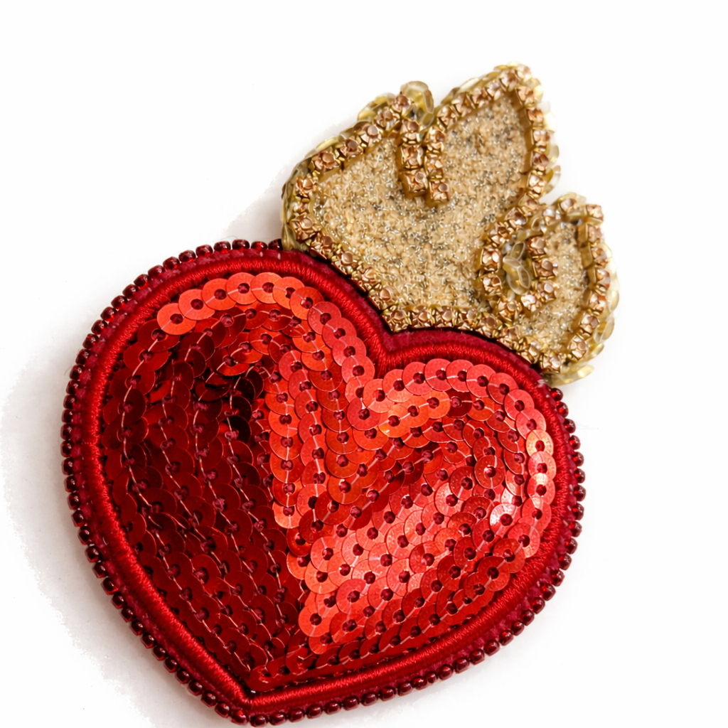 Spilla interamente realizzata a mano, dal disegno su carta al ricamo su peltro. Intero cuore realizzano con paillettes rosse , catene di strass, perline per la bordatura. Retro rifinito in simil-pelle. I cuori sacri sono utilizzati da sempre come dettagli su outfit rock e determinati