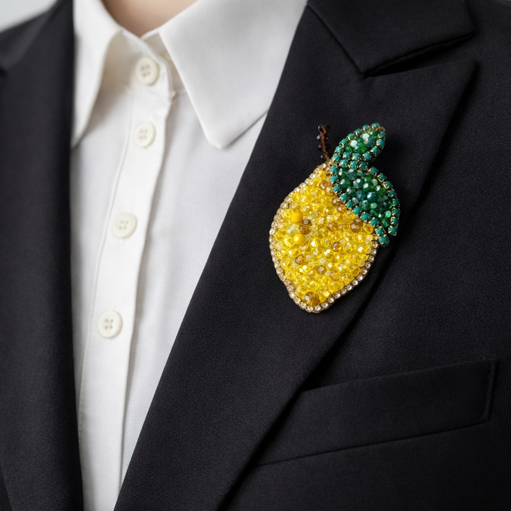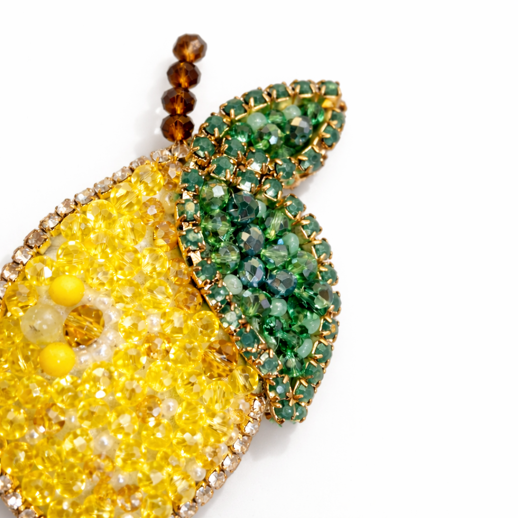 Spilla interamente cucita a mano, dal disegno su carta al ricamo su feltro. Catene di strass per la bordatura, cristalli gialli e verdi. Retro rifinito in simil-pelle. I limoni da indossare, per personalità allegre e determinate. I limoni rappresentano la “mia ” amata costiera Amalfitana, dunque non potevano mancare all’appello delle creazioni