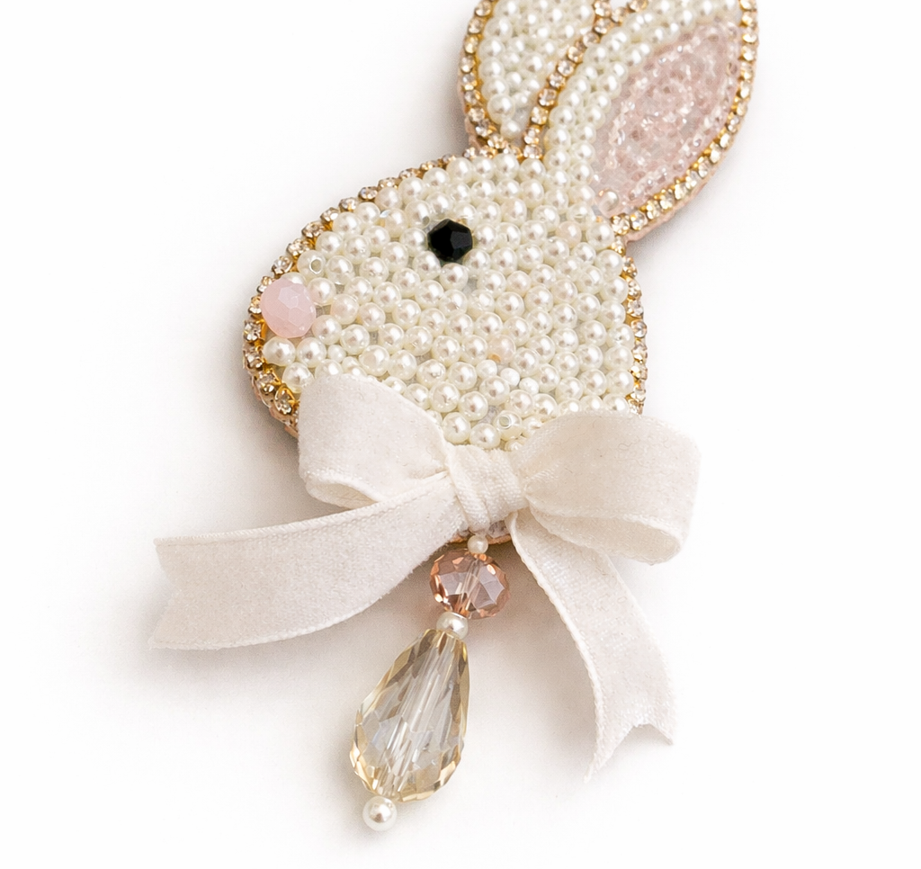 Spilla interamente realizzata a mano, dal disegno su carta al ricamo su feltro. Perle sintetiche bianche, cristalli rosa, catene di strass su montatura argentata, cristallo nero per l’occhio, fiocchetto in velluto bianco, goccia di cristallo pendente. Retro in simil-pelle. Un dettaglio simpatico per rendere unici i tuoi outfit
