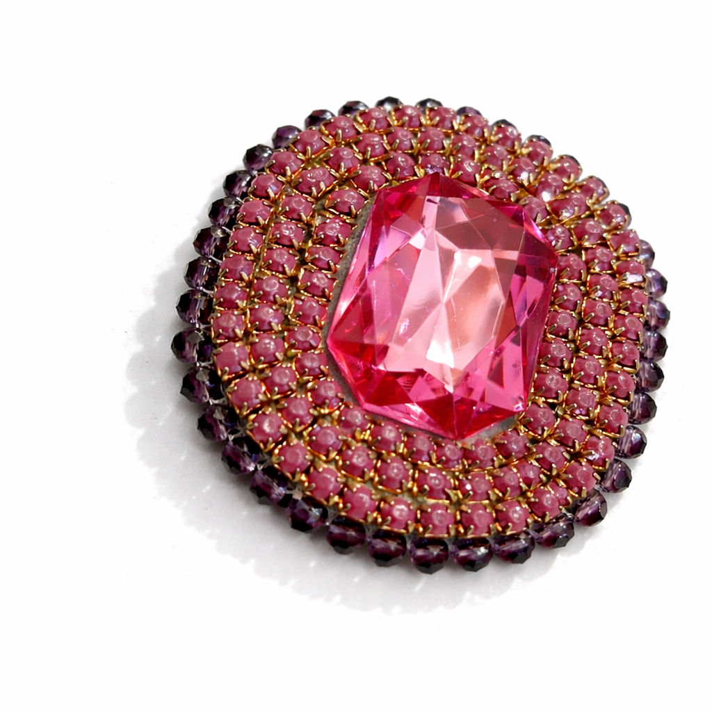 Spilla interamente cucita a mano. Cabochon di cristallo in resina, catene di strass, perline per la bordatura. Retro rifinito in simil-pelle. Un dettaglio da indossare su camicie, capi spalla, maglioni, t-shirt