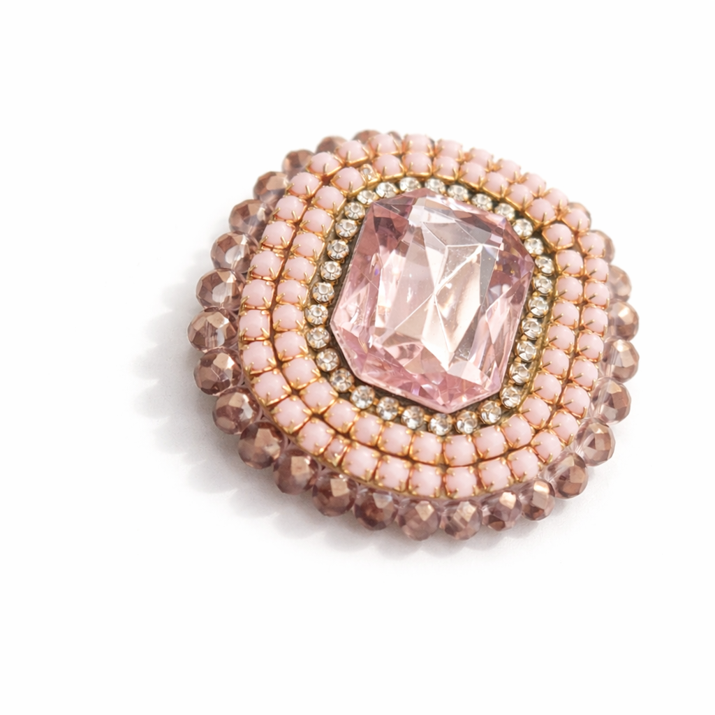 Spilla interamente cucita a mano. Cabochon di cristallo in resina, catene di strass, perline per la bordatura. Retro rifinito in simil-pelle. Un dettaglio da indossare su camicie, capi spalla, maglioni, t-shirt