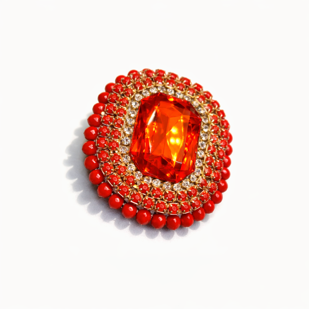 Spilla interamente cucita a mano. Cabochon di cristallo in resina, catene di strass, perline per la bordatura. Retro rifinito in simil-pelle. Un dettaglio da indossare su camicie, capi spalla, maglioni, t-shirt