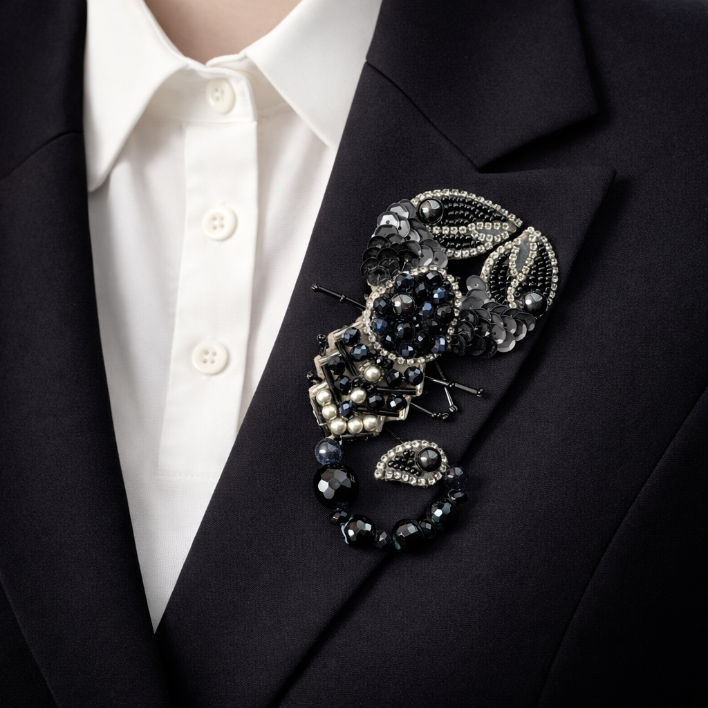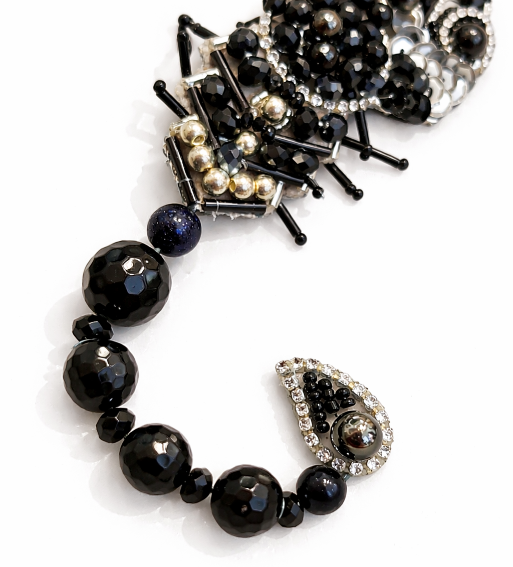 Spilla interamente realizzata a mano, dal disegno su carta al ricamo su feltro. Cristalli neri di varie dimensioni, corallini neri, sfere magnetiche canna di fucile, paillettes, catene di strass, agate(pietre dure semipreziose) per la coda, corallini tubolari neri per zampe e corpo. Retro rifinito in simil-pelle. Indossa ciò che caratterizza di più il tuo essere. Un accessorio ricco di significato per chi ama i segni delle stelle