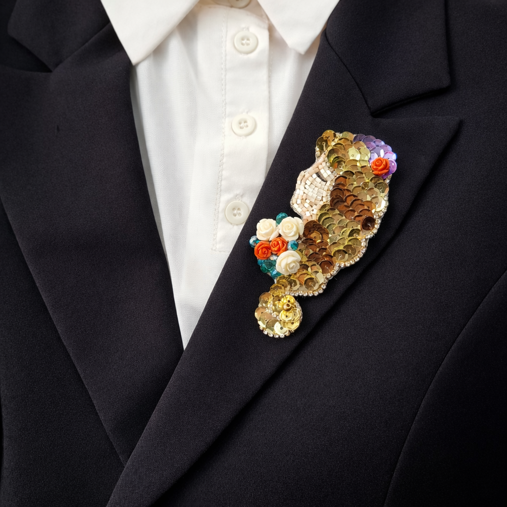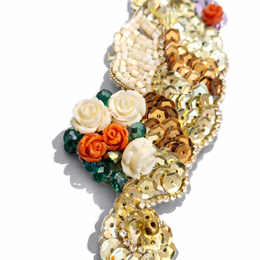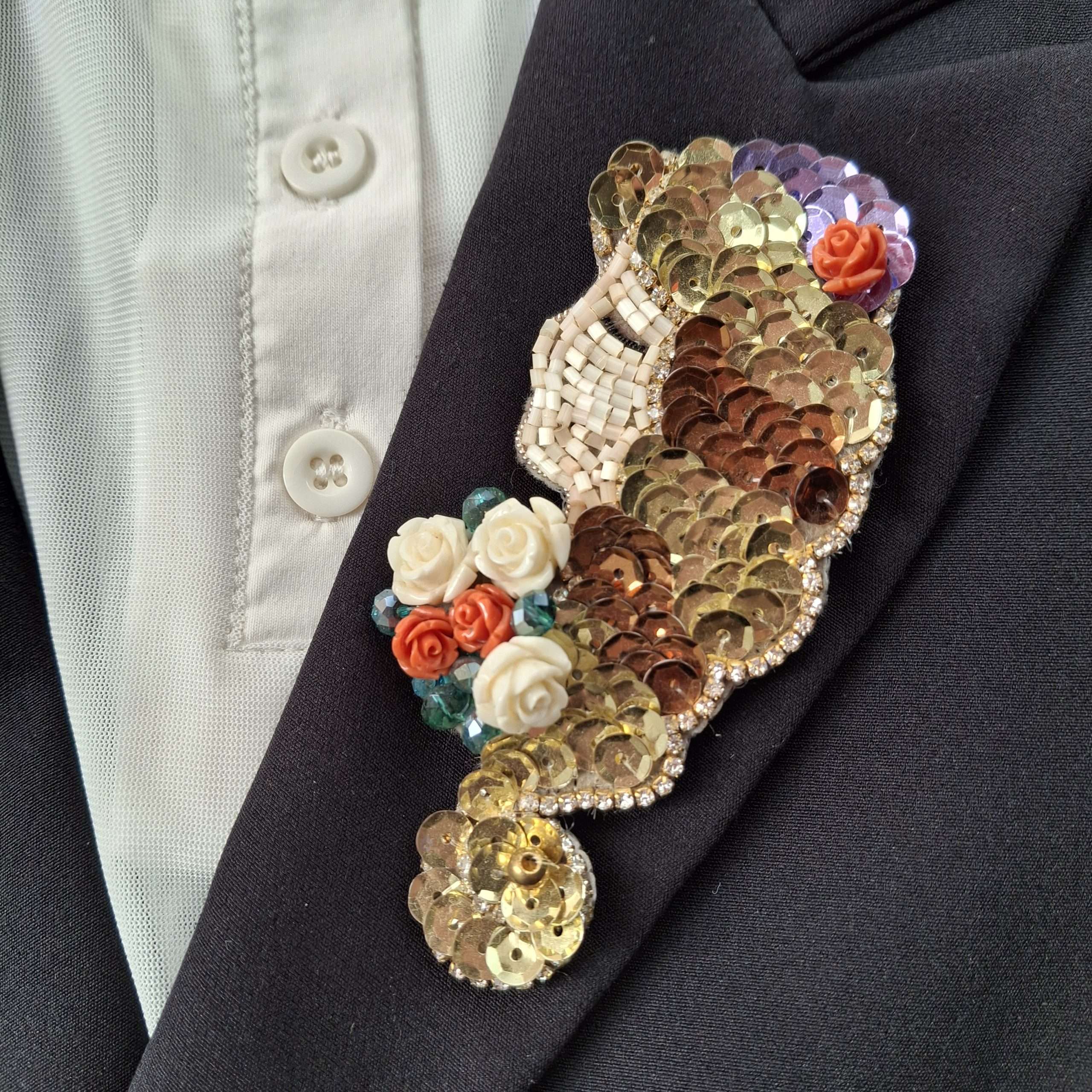 Spilla interamente realizzata a mano, dal disegno su carta al ricamo su feltro. Paillettes, roselline di pasta polimerica, corallini tubolari ,cristalli verdi, catene di strass. Retro rifinito in simil-pelle. Indossa ciò che caratterizza di più il tuo essere. Un accessorio ricco di significato per chi ama i segni delle stelle