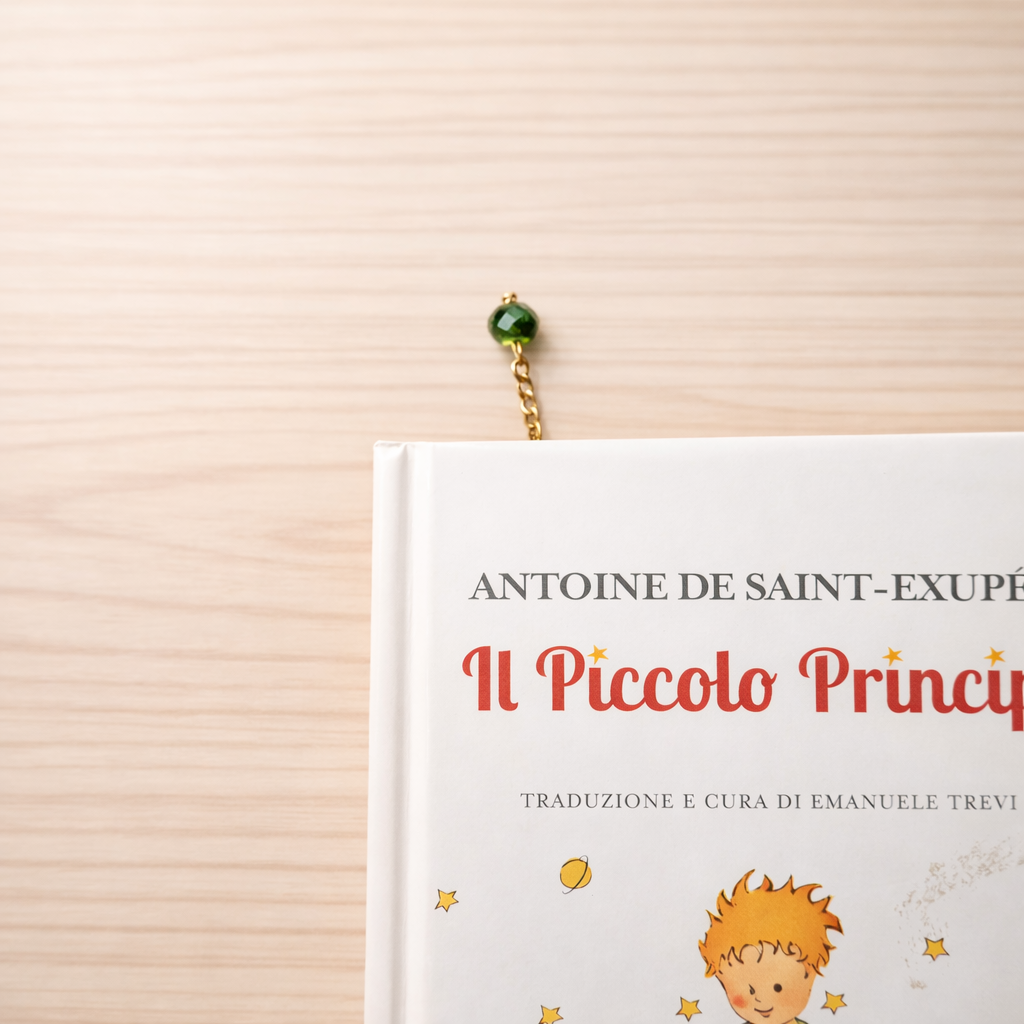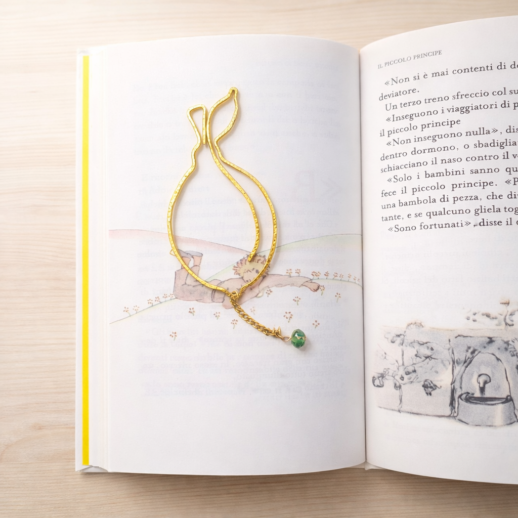 Questo elegante segnalibro artigianale è realizzato a mano in filo di alluminio anodizzato dorato. Modellato e martellato con cura per creare la forma raffinata di un limone. Il design sinuoso e leggero si abbina a un delicato charm con cristallo verde, che aggiunge un tocco luminoso e distintivo. Perfetto per chi ama la lettura e i dettagli personalizzati. è ideale come idea regalo o come bomboniera e cadeaux per gli ospiti di un tuo evento speciale